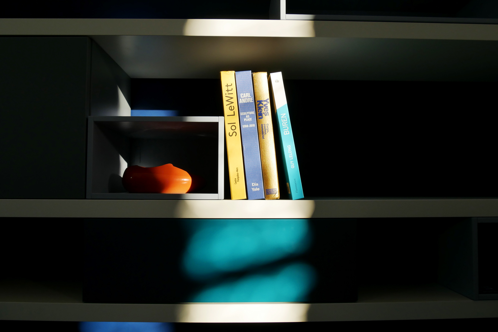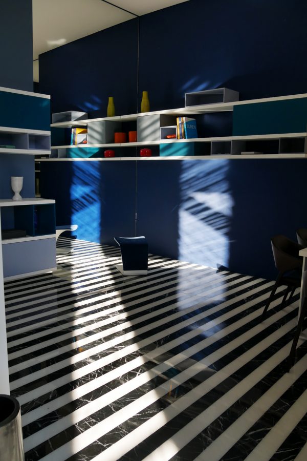 Épurée, géométrique et jouant sur les miroirs pour augmenter les volumes de la pièce (tant au sol que sur les murs), cette cuisine se transforme, avec toutes ses étagères en une bibliothèque dédiée à Buren.