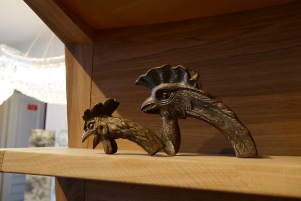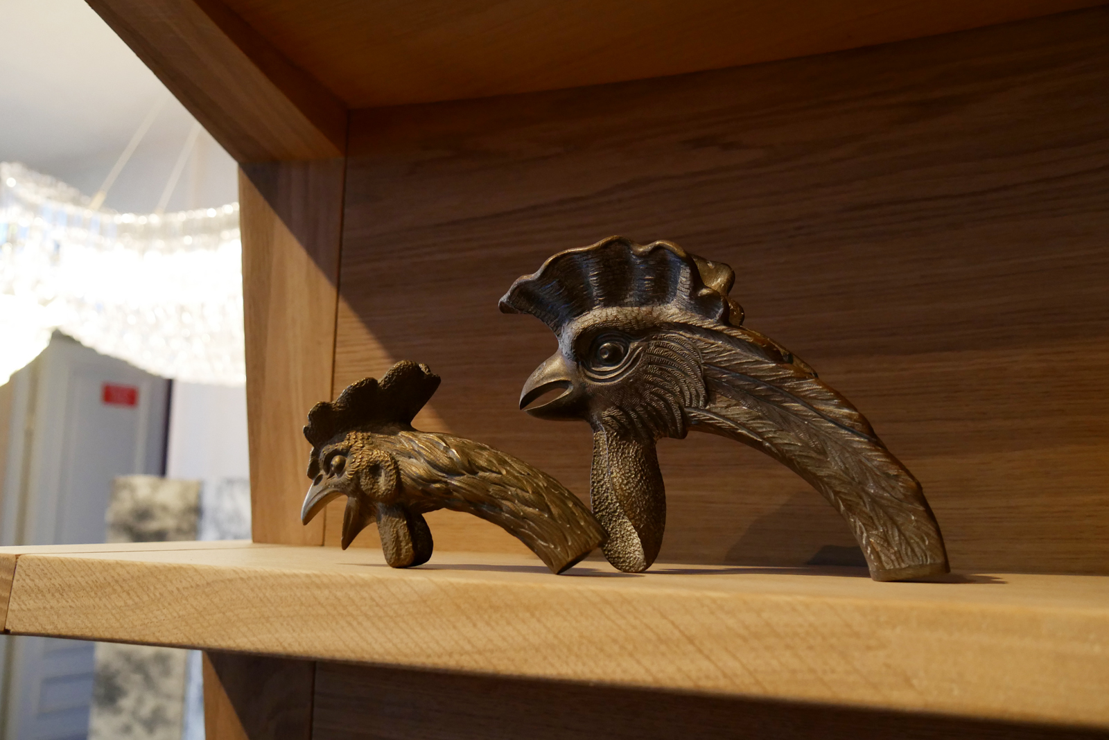 En résonance, les deux grandes bibliothèques très épurées exposent une collection de moules de fonderie servant à la confection de décorations végétales et animales.