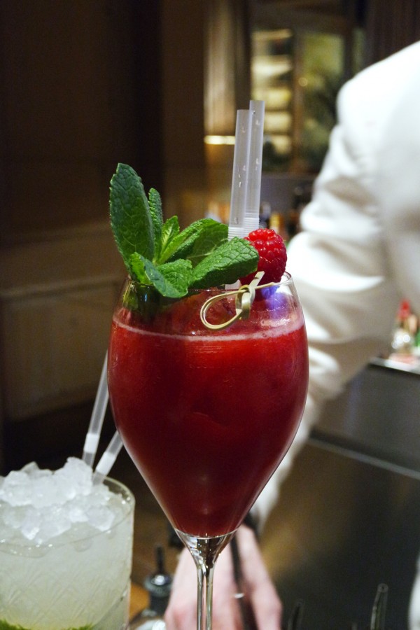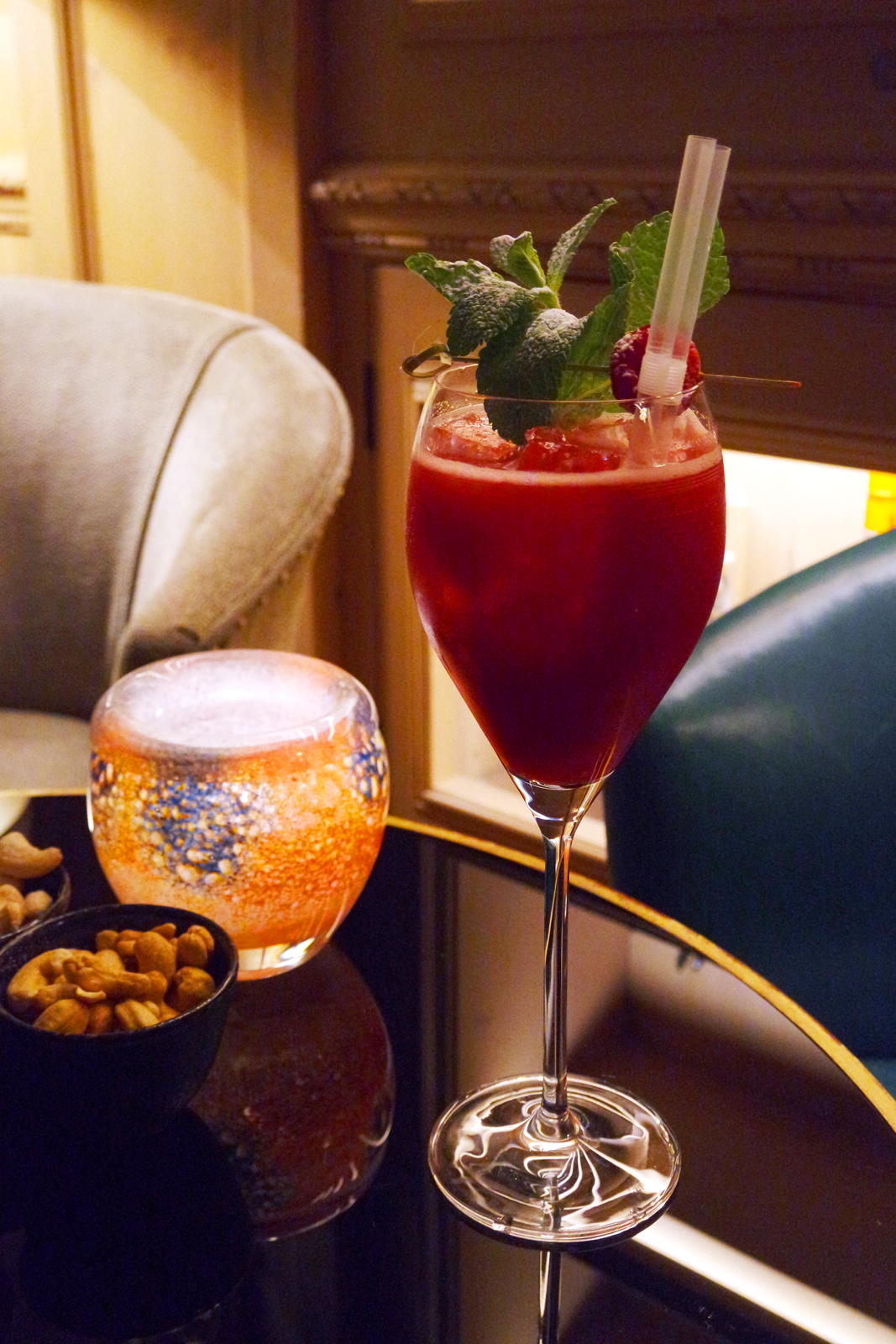 Purée de framboise, gingembre, citron, verveine infusée avec du poivre de Jamaïque, avec ou sans champagne, suivant vos envies, le Red Dingue est vraiment délicieux.