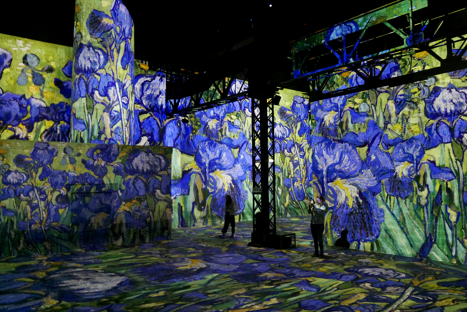 Chorégraphie de fleurs, ballet d’iris et de coquelicots, paysages, portraits d’inconnus, villages s’étalent sur les murs de l’Atelier des Lumières.