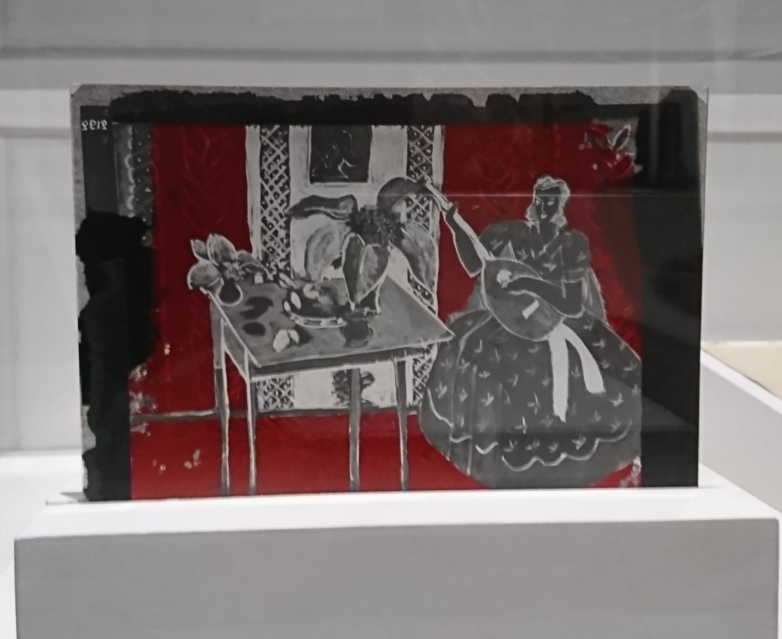 Pour La Femme au luth, Henri Matisse a fait le pari de la témérité. Conventionnellement, l’artiste aurait dû partir du tableau initial peint en 1943. Cependant, il a choisi de prendre une reproduction en couleur de l’œuvre. Il a ensuite réalisé un agrandissement photographique qu’il a retravaillé. En effet, il a entre autres ajouté une bordure à entrelacs et modifié le motif rond du tapis en une arabesque continue.