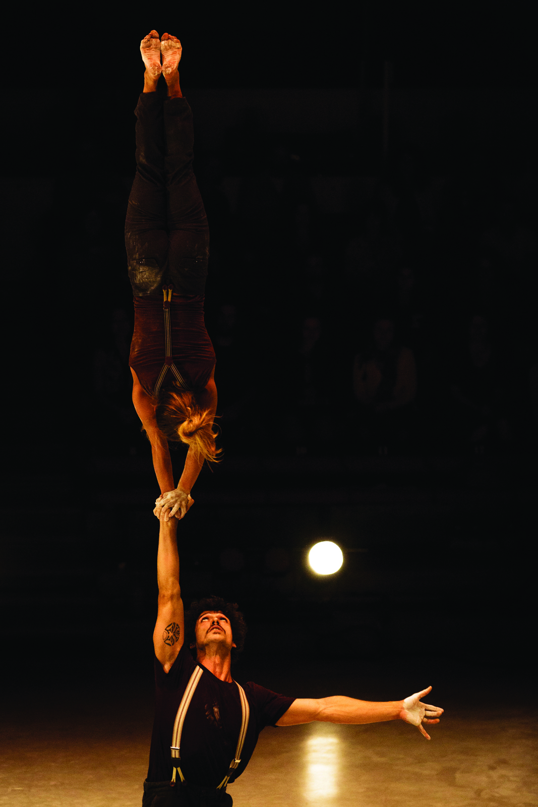 Les portées (main à main) et sauts dans les airs font frémir, mais sont toujours rattrapés. Dextérité totale quand une trapéziste à l’accent québécois se met à chanter la tête en bas ou quand elle rattrape une de ses partenaires. Exceptionnellement, les voltiges aériennes de ce spectacle ne sont pas mixtes. Les 4 jeunes femmes (Gabi, Garance, Lucie, Léa) nous bluffent avec leur cadre aérien. Leur aisance nous apporte frisson sur frisson.