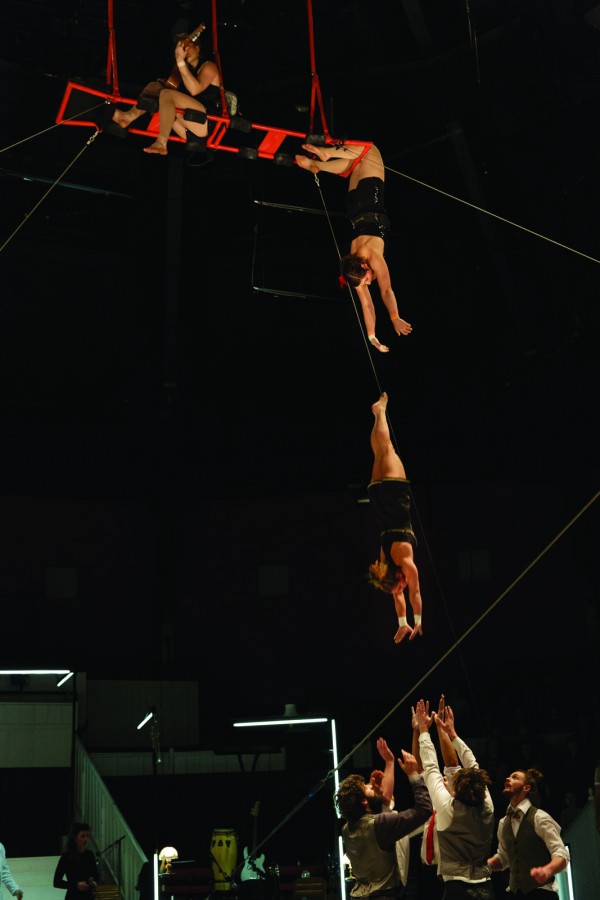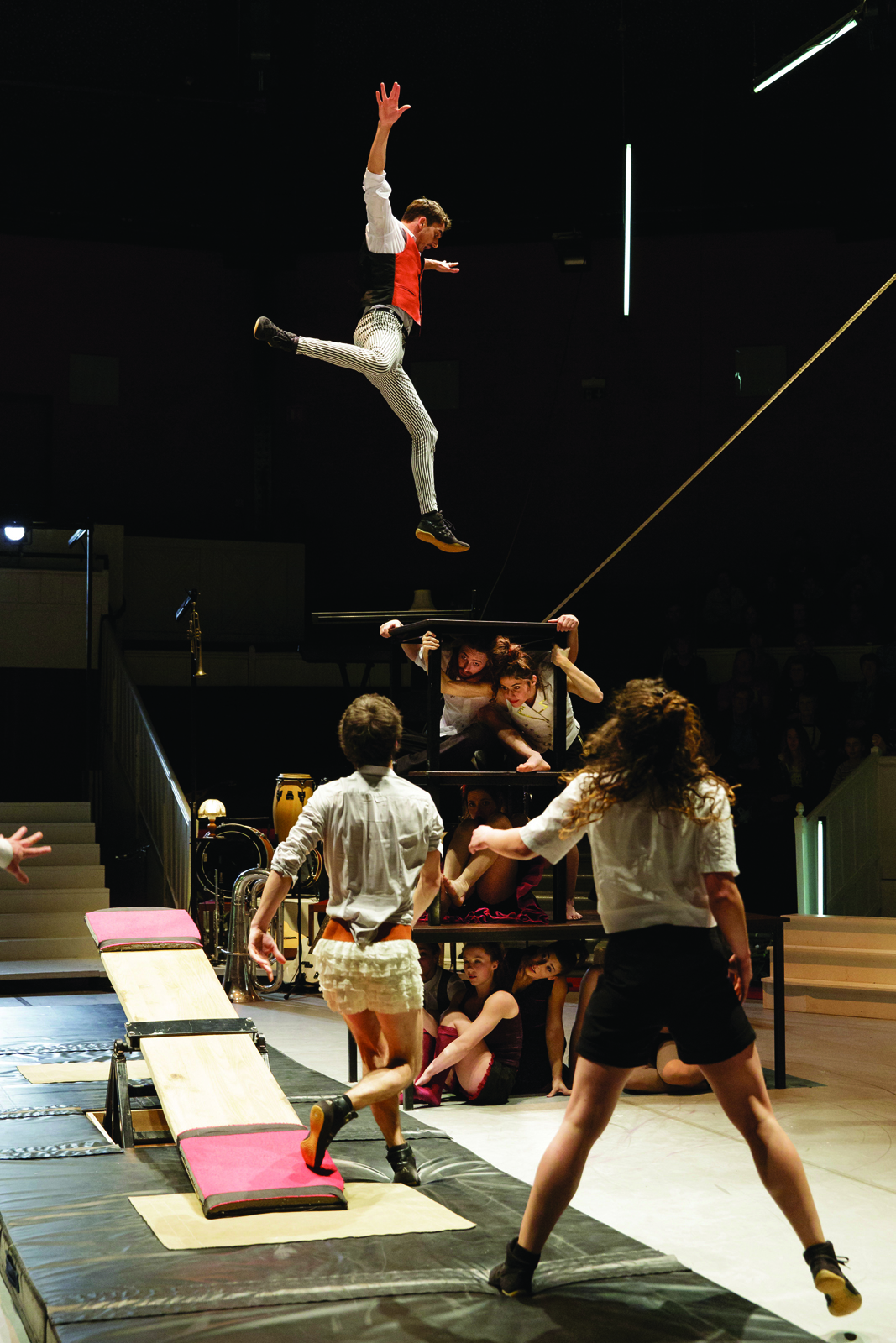 Devant vous, l’adresse de jeunes virtuoses qui s’exprime dans des duos de main à main, au bout de sangles, en haut du mât chinois ou indien, avec une bascule coréenne ou avec un cadre aérien.