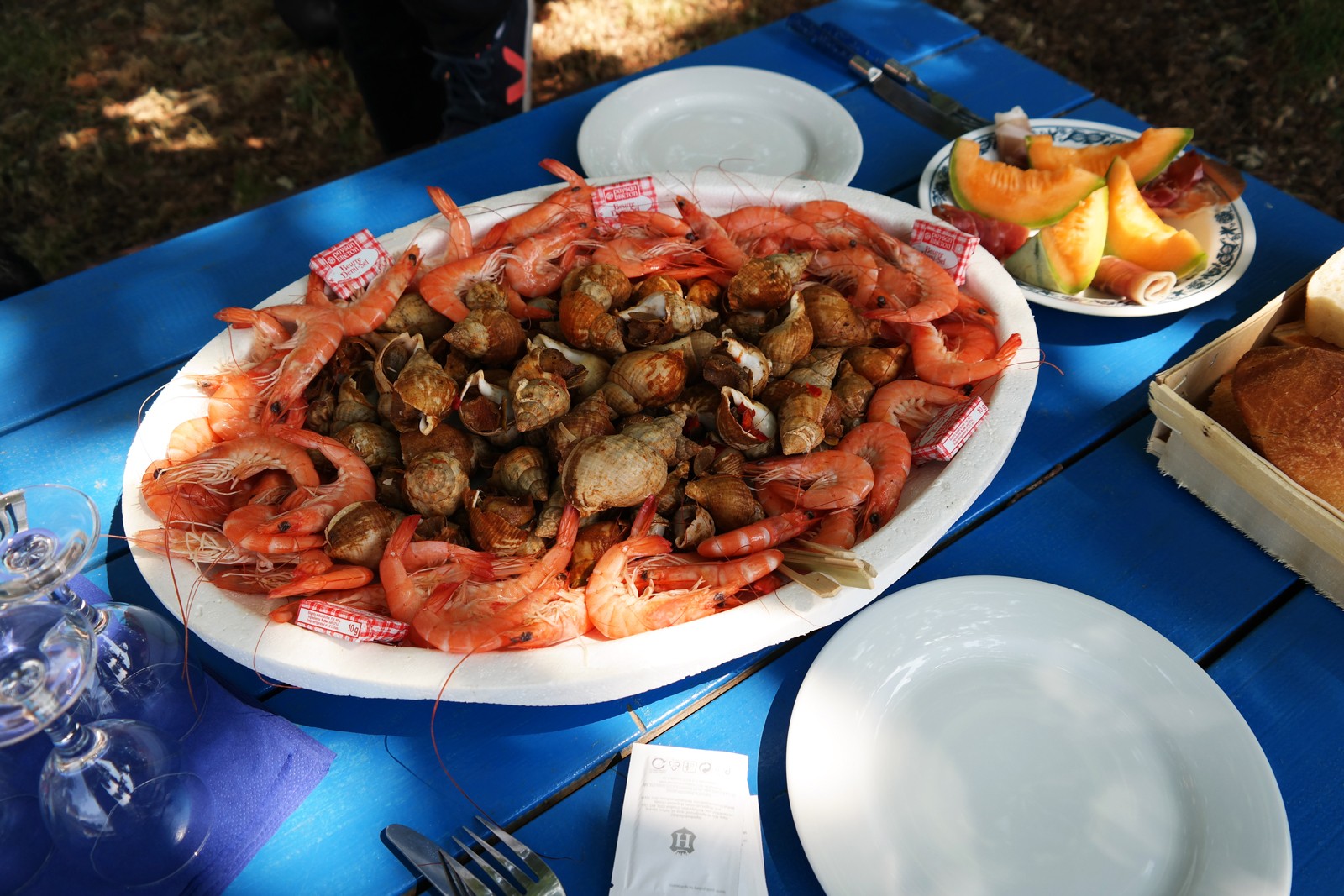 Rien d’étrange en ligne de mire. Juste l’idée qu’un pique-nique ici pourrait être un pied total. Notre voeu est exhaussé avec notre pause déjeuner. A l’abri du soleil ardent, sous un grand arbre, les bancs et table en bois nous accueillent pour ripailler à grands coups de fruits de mer (grosses crevettes, huitres, bulots, bigorneaux), melon, jambon et autre pâté de la région. Simplicité, authenticité sont les maitres mots de la cabane ostréicole du jeune Antoine Duvignac.