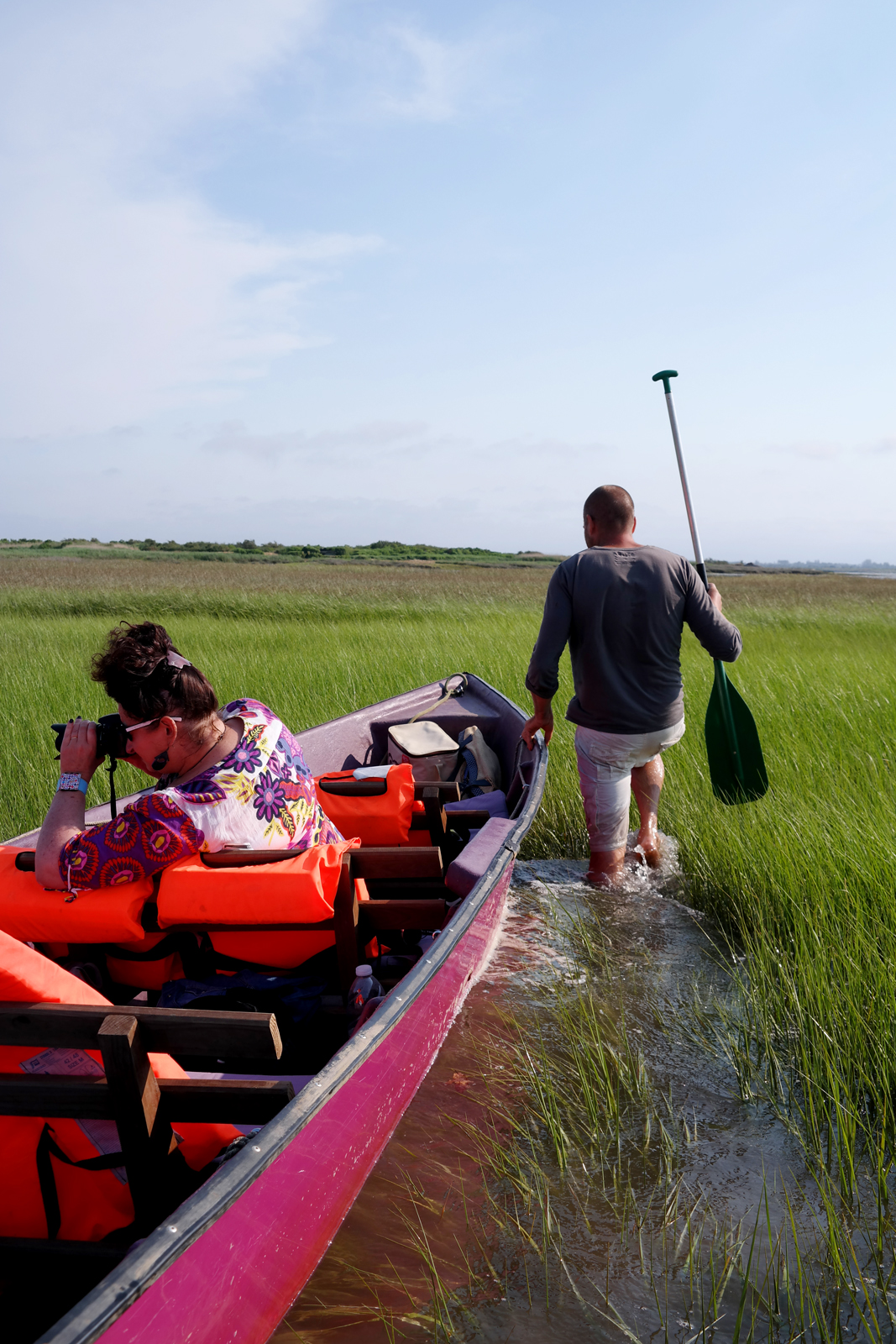 En fin d’après-midi, retour au port toujours aussi paisible. Rendez-vous avec Yannick, le batelier de Lou’batel’Eyre, pour une balade en galupe (barque gasconne) sur la rivière Eyre. Au coeur du Parc Naturel Régional des Landes de Gascogne riche de variétés animalières et bordés de roseaux, flotte notre embarcation. Loutres, visons, ragondins, tortues d’Europe, milans noirs (rapace), cigognes, échassiers vivent ici en toute quiétude. Le cadre est tellement accueillant que le phoque You a même été aperçu, pataugeant joyeusement, l’année dernière. Reviendra-t-il cet été piquer une tête, alors que sa présence dans le Bassin d’Arcachon a été confirmée en juin ? Ouvrez l’oeil mais gardez vos distances, l’animal est sauvage et doit le rester.