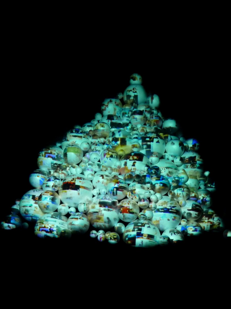 Pas d’écran plat au menu. Que des formes originales : bulle gonflable miniature rappelant le Leviathan d’Anish Kapoor présenté dans la Nef du Grand Palais, nuée de ballons isolée dans un angle de salle avec projections de télévisions étrangères (Éblouis d’images du monde) ou encore surfaces rocheuses (Enrochement d’ombres).