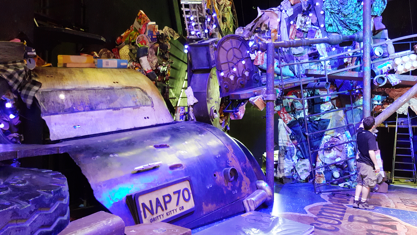 Même si le public retrouvera les éléments principaux sur scène, comme la voiture et l’engrenage à l’échelle des yeux de chats, les éléments de décors qui entourent le plateau sont uniques pour cette production française. Les décorateurs se prennent un malin plaisir à dégoter de nouveaux accessoires, à les façonner et les vieillir pour leur donner une patine spécifique et finalement les intégrer à la scène pour créer un univers unique.