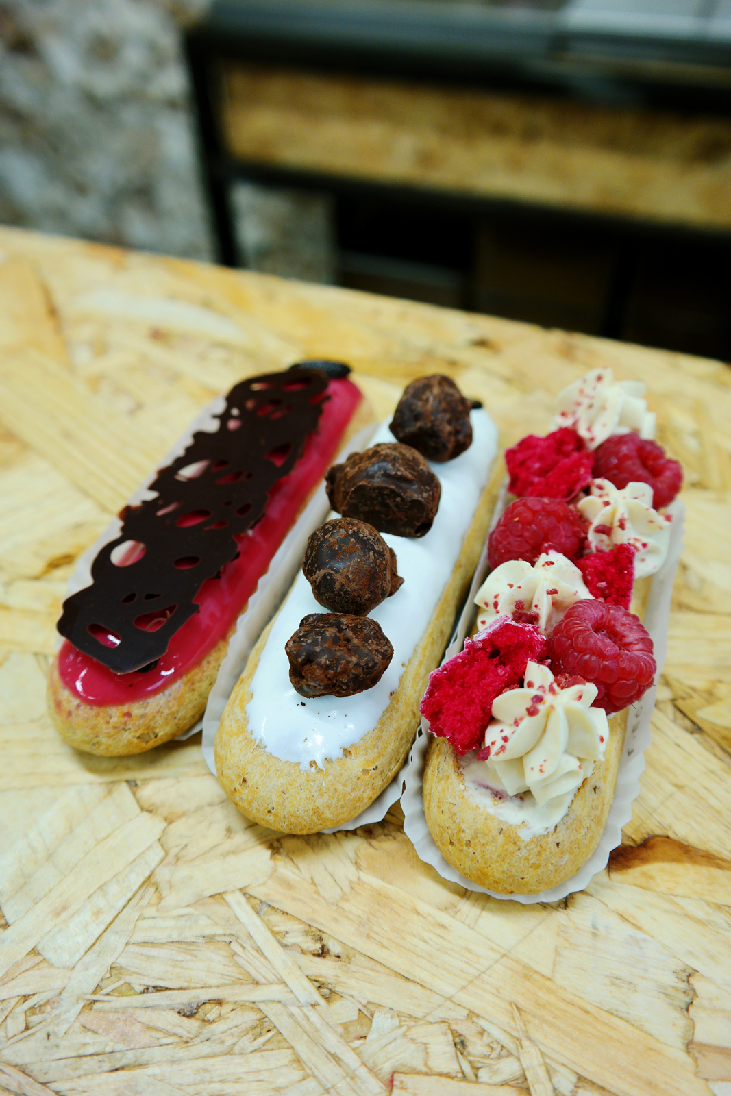Olivier de Benoist a inspiré l’éclair n°151 ; il voulait de la framboise et de la couleur. Et ce très bel alliage de confit framboise fleur d’oranger et de ganache montée dulcey avec de vraies belles framboises posées à la main répond à ses attentes. Avec le petit plus : les morceaux de biscuits de Reims made in Eclair de Génie. Et ne nous faîtes pas dire que c’est notre préféré. Nous ne les avons pas tous goûtés, mais il se dégage du trio que nous avons approché. D’autant qu’il nous rappelle nos barlettes chéries.
