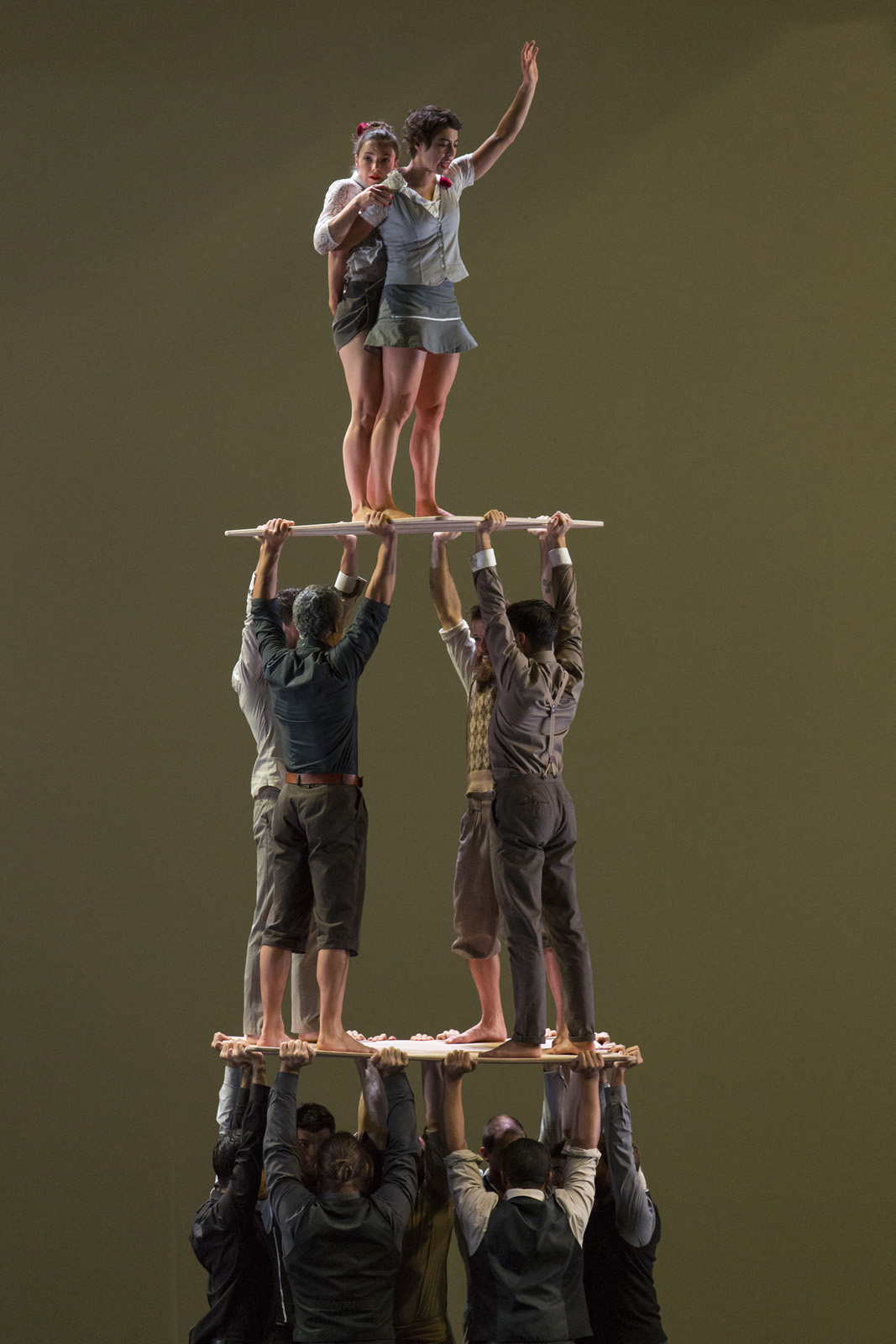 Ici, point de metteur en scène, ni de directeur artistique. Les idées ont fusée pendant 4 mois et tous les membres de la compagnie pour créer Il n’est pas encore minuit. Seule l’aide d’un chorégraphe a été sollicitée Loïc Touzé essentiellement pour avoir “un regard extérieur“, comme confie un des interprètes. Alors que le précédent spectacle, Le Grand C, était un peu trop centré sur les portées (un acrobatique debout, les pieds bien arrimés aux épaules de son ou sa partenaire), les sauts périlleux, joyeux, multiples et autres figures enchanteresses de cette création 2015 impressionnent avec une réelle intensité.