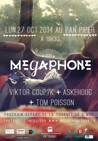 Pour sa soirée de lancement de la saison 2014/2015, le Mégaphone Tour a choisi la scène du PAN PIPER le 27 octobre. Cette soirée sera assurée par des artistes ayant déjà profité de ce dispositif : Askehoug (Mégaphone 2010) et Viktor Coup?K (Mégaphone 2014) et un artiste partenaire : Tom Poisson.