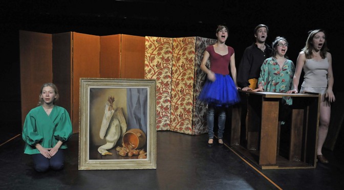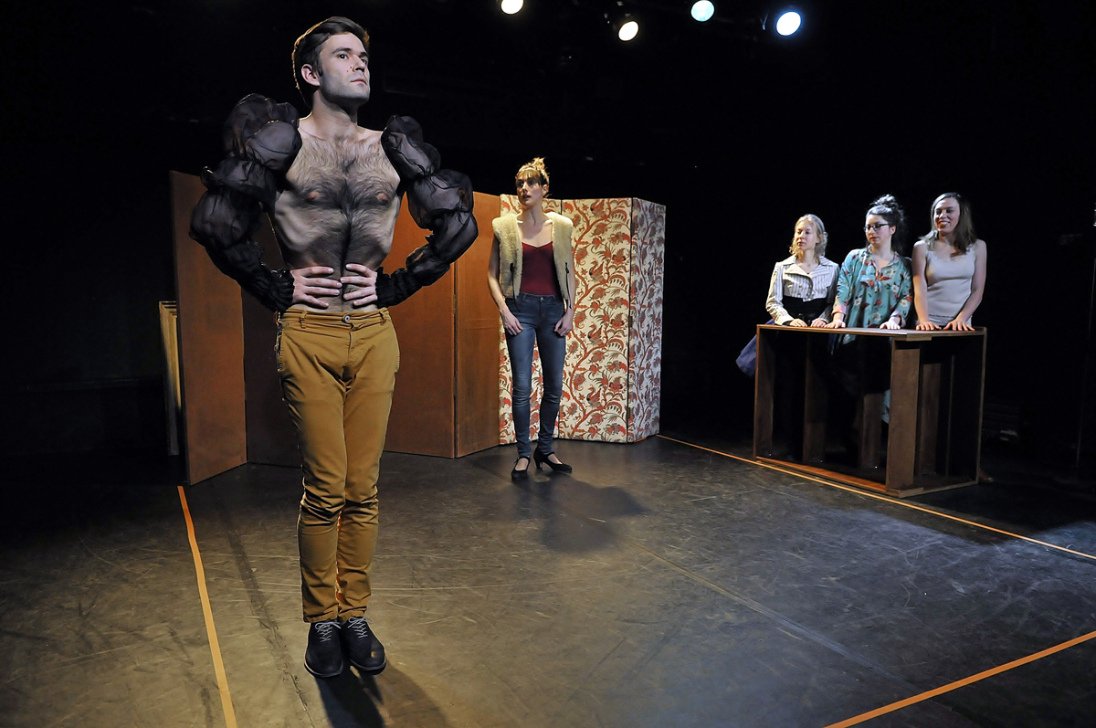 Les paravents servent de rideaux de scène cachant aussi bien les accessoires, les changements de costumes, que la faiblesse des moyens. On pourrait croire ce spectacle improvisé : il n’en est rien. La mécanique des changements d’acteurs pour composer un même personnage, le chœur qui prend l’eau alors qu’un balai est sollicité pour plusieurs fonctions – inouï ! – valent des moments de franche rigolade.