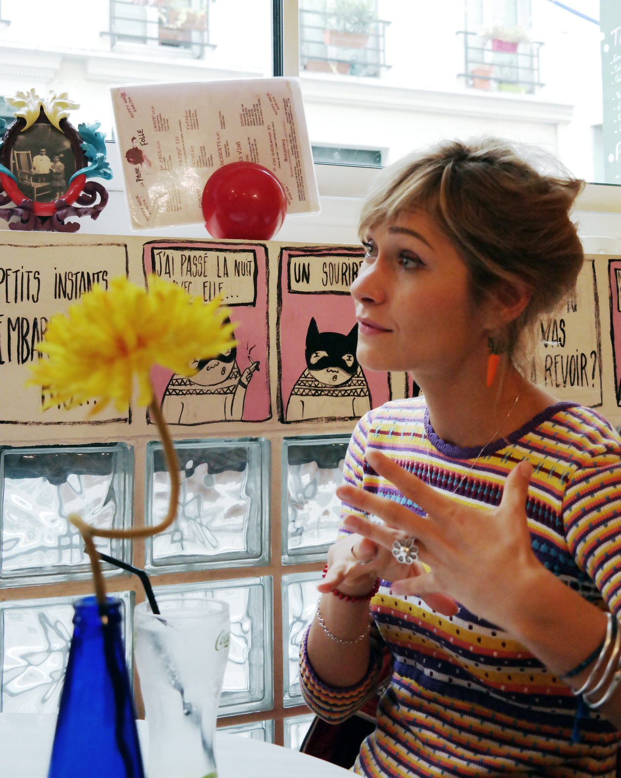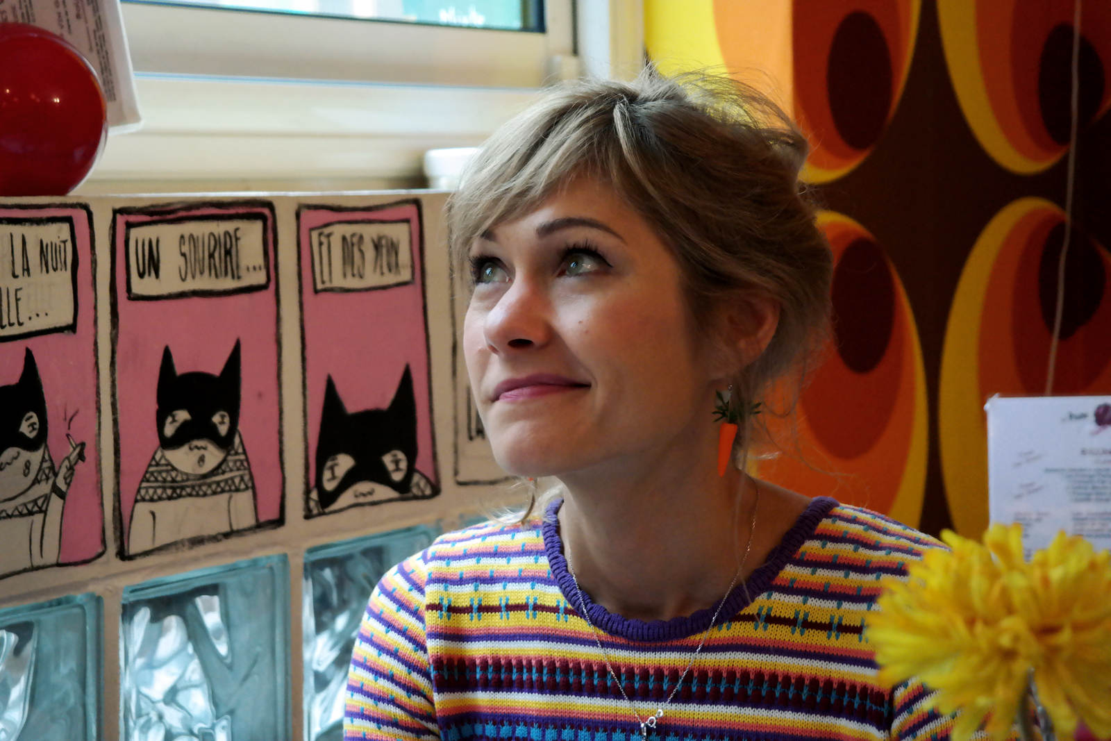 Un jeudi de septembre, dans un petit bar du XIe arrondissement de Paris. GiedRé, fidèle à elle-même, habillée d’une jolie robe tout en couleurs et des carottes aux oreilles.