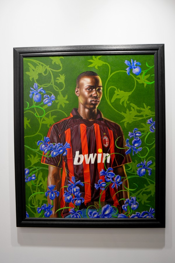 Le premier : Kehinde Wiley représenté par la Galerie Daniel Templon à Paris. Le portraitiste américain nous offre une nouvelle rencontre, cette fois c’est Mtar Mbaye qui nous fait face. Il est saisi avec son maillot. Aucune information sur le garçon. Le portrait parle de lui-même.