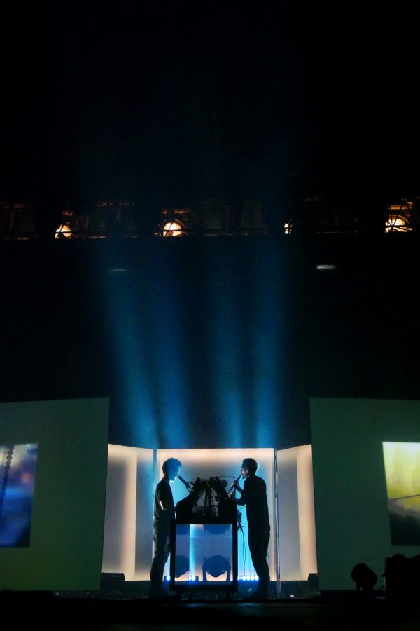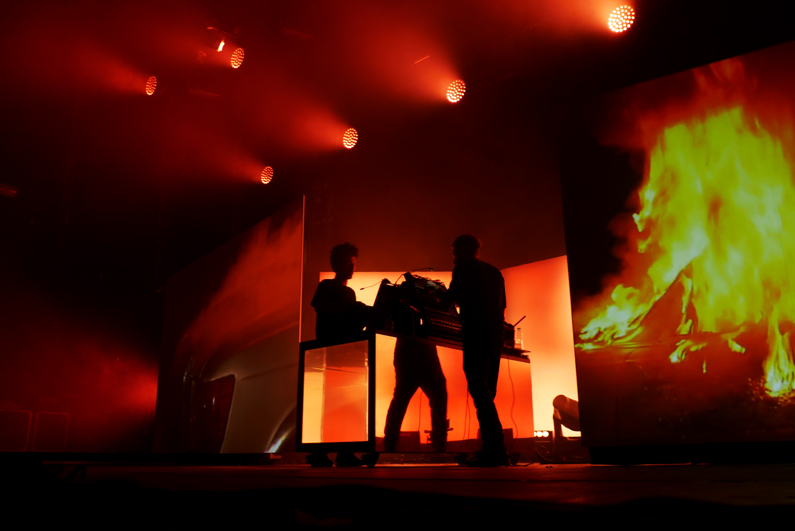 Leur show visuellement fait l’effet plus d’une installation artistique que d’un DJ est à la manière de Cassius. Projections d’images sur écran, jeu de formats aussi avec réduction du cadre, teintes de lumière en fonds, table réfléchissante.