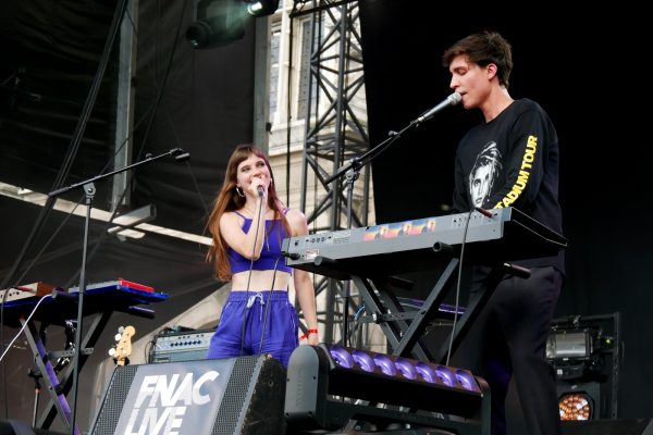 Léo arrive sur scène t-shirt manche longue à l’effigie de Justin Bieber. Le ton est donné. Le duo, Vickie et Léo, entouré de leur band balance une pop chaleureuse, énergique et espiègle, pour la musique en tout cas. Les textes semblent plus sombres.
