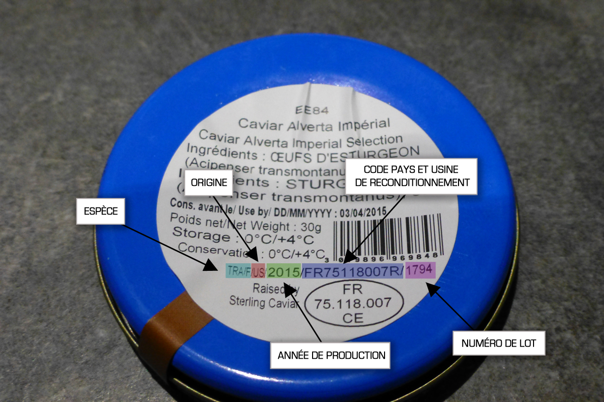 Quand un esturgeon est à maturité, la poche est prélevée et aucun mélange n’est fait avec d’autres poches. Pour garantir la traçabilité du lot, un numéro est apposé que vous retrouvez sur l’emballage de votre achat.  Un exemple pour faciliter votre décryptage de l’étiquette.