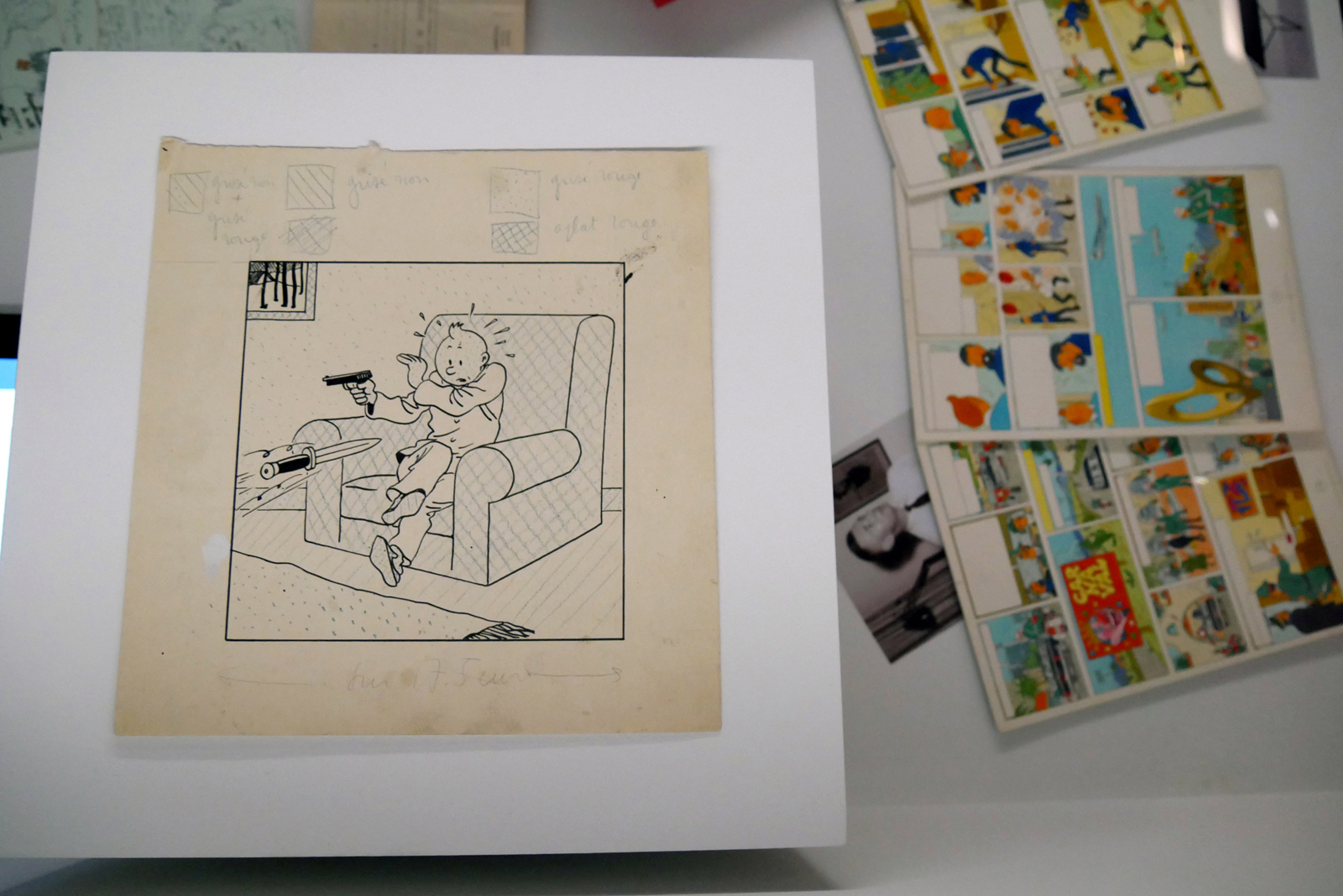 Mais coups de bluffe aussi quand on perçoit les traits de Tintin à travers les nombreux crayonnés présentés, le passage à l’encre et les aquarelles et gouache (bleus de coloriage). Toutes les étapes de la conception de la bande-dessinée sont documentées.