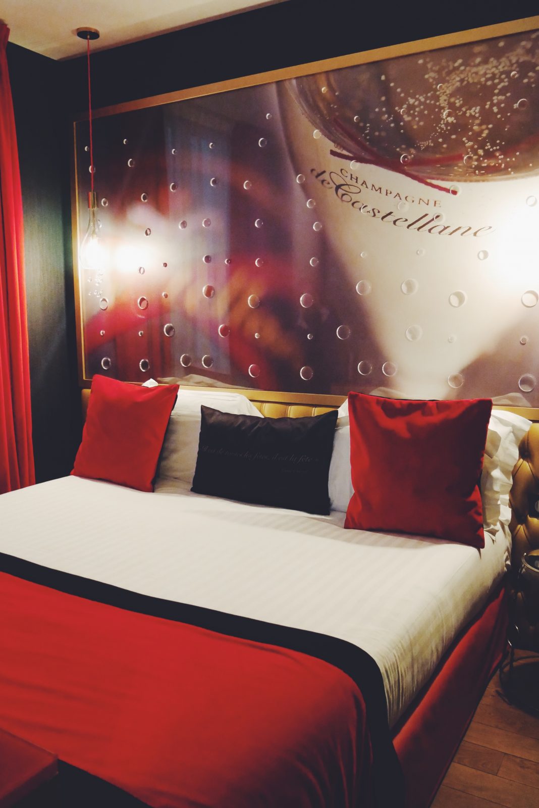 Kitsheries en pagaille aux Bulles de Paris ! Il faut accepter le deal dès le départ, sinon gros risque de succomber aux excès de la déco. Ça pétille de partout : des fausses bulles dans l’ascenseur aux tables bouchons en liège, des murs avec citations aux chambres au noms de prestigieuses maisons de champagne.