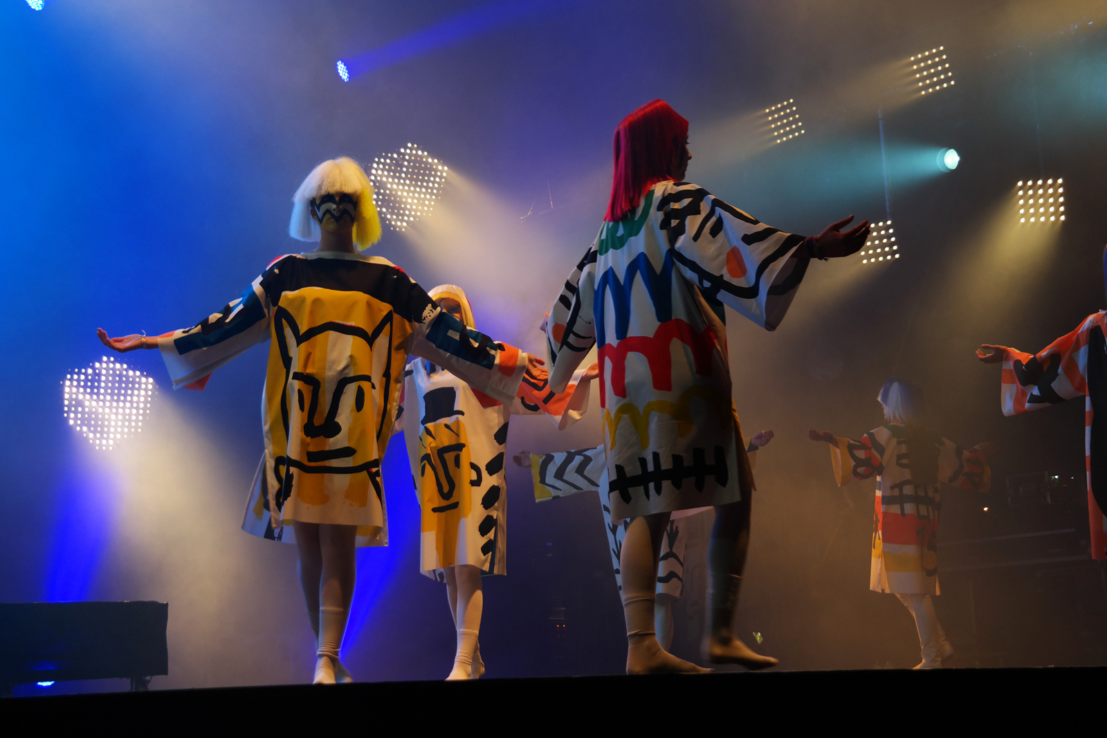 Le temps est compté. La répèt sur la scène doit se faire après la balance de Yelle. Impressionnante vision que cette armée de girls en plein soleil attendant son tour pour prendre ses marques sur le terrain de jeu du soir. Une d’entre elles est déjà coiffée d’une perruque, et toutes sont habillées par le couturier.