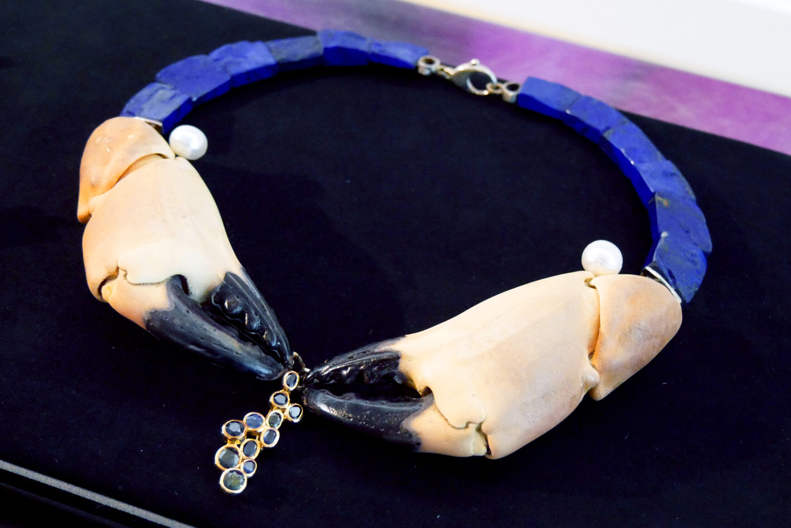 Vers la fin de sa vie, il a continué à chercher de nouveaux matériaux pour ses bijoux. Ainsi, ce collier avec de vraies pinces de tourteaux (vidées personnellement par l’artiste !) en est l’expression directe.