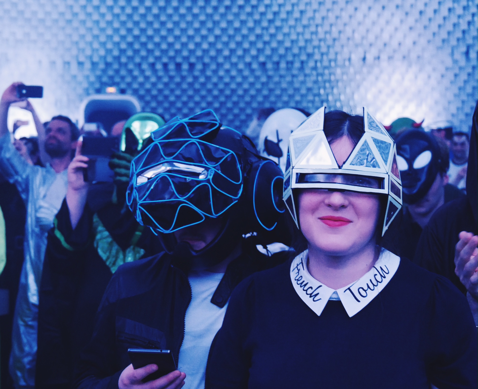 Avant d’entrer dans la soucoupe, passage obligé par un parcours hilarant et initiatique. Visite médicale contre un mur avec une infirmière allemande en talons, cours de synthés collectif pour connaitre l’air de Rencontres du 3e type, test de culture cinématographique à côtés des avatars de Joachim et connaissance des 10 commandements, avant le compte à rebours et ouverture des portes de la salle de djset.