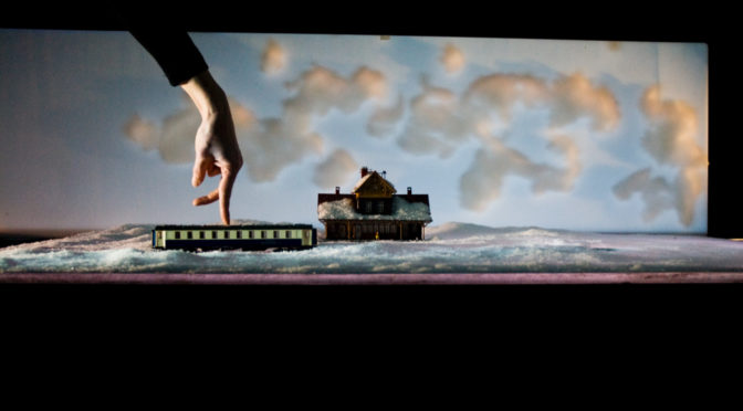 Dès notre arrivée, la scène interroge. Nous avons l’impression d’être en coulisses. Alors, à côté de caméras se mêlent un aquarium, une maison de poupée ou encore un circuit de train électrique. Et, trônant au dessus de tout ça, un grand écran blanc, vide.