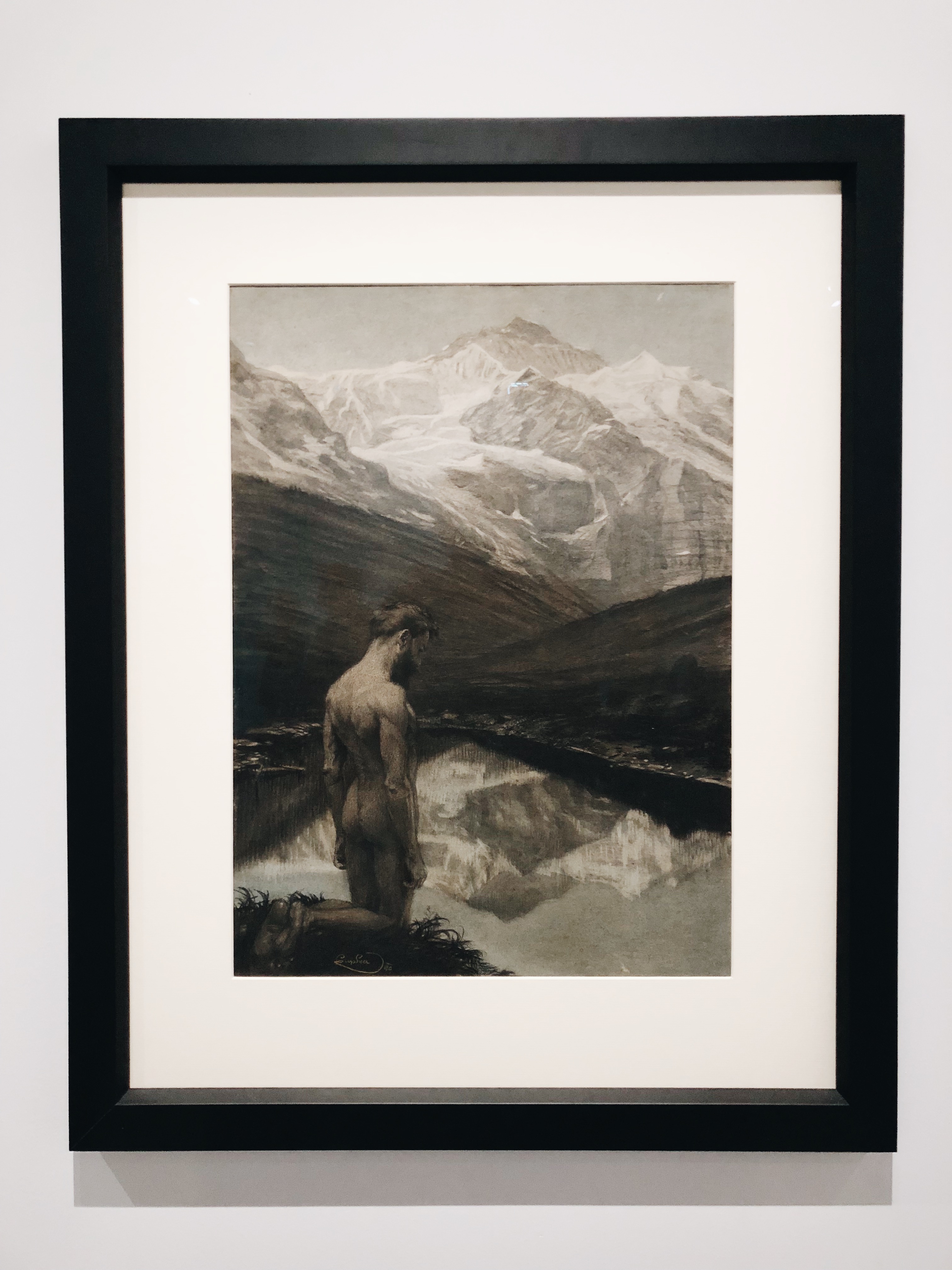 Cette oeuvre saisit à la fois par sa technique (craie et fusain sur papier) et cette pose face à une montagne impressionnante et son reflet dans l’eau.