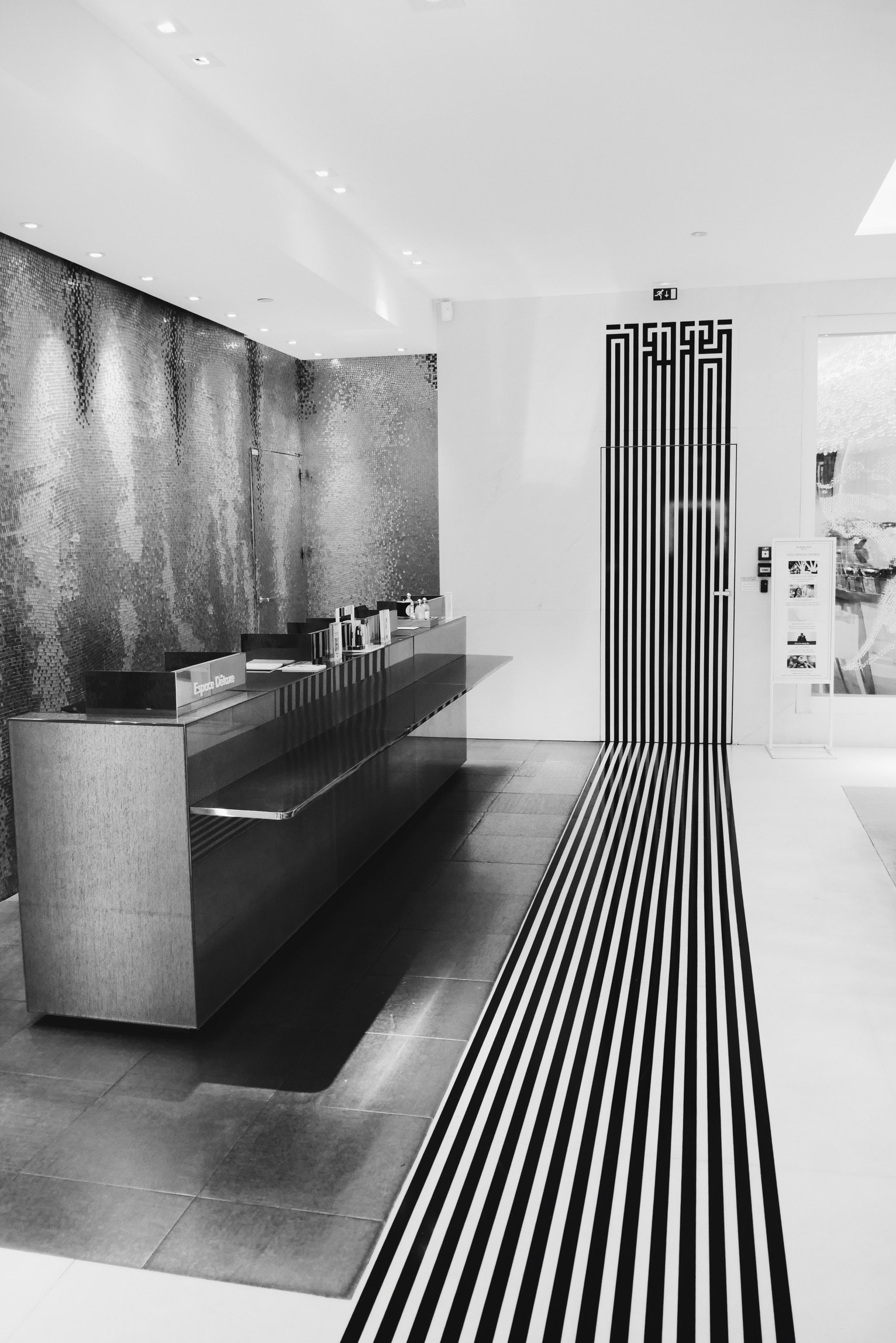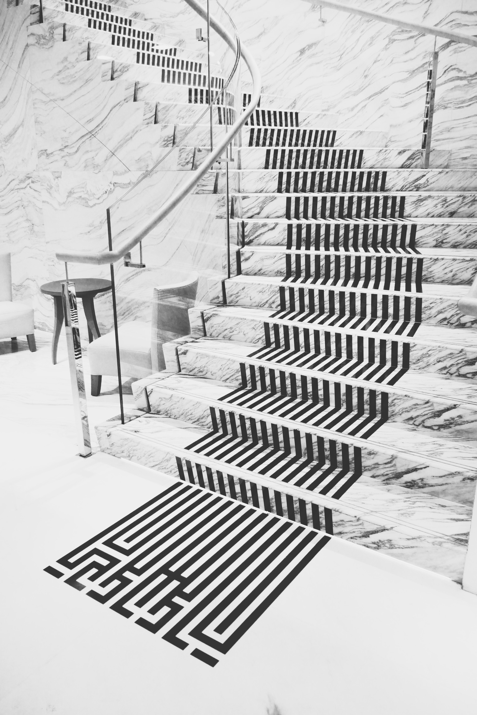 Jusqu’au 26 février, les 3 niveaux de la boutique des Champs-Élysées accueille les jeux géométriques avec la complicité de la galeriste Magda Danysz, commissaire d’exposition, sous forme de toiles et de ruban adhésif collé à même le sol.