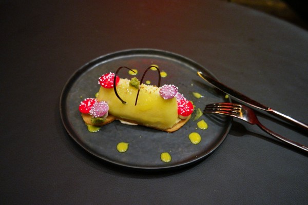 Petit sablé breton surmonté d’un caramel miso vanille et de sa coque de mousse coco, le tout enfermant un coeur ananas ! On craque face à la subtilité et à la finesse de ce dessert qui allie modernité et tradition avec ces petits champignons déco en meringue, ultra craquants.