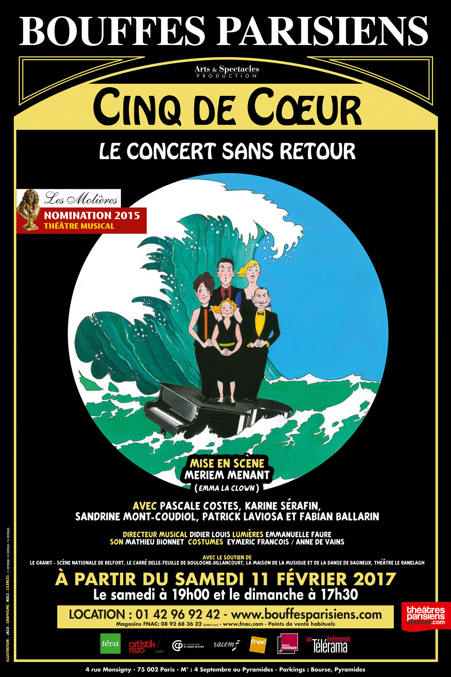Aux Bouffes Parisiens, tous les dimanche et lundi, clownesque concert qui dérape pour des moments de purs délires visuels et vocaux. Le groupe a cappella Cinq de Cœur revient avec un best-seller qu’il tourne depuis deux ans et qui est prêt à conquérir de nouveaux spectateurs friands d’expériences musicales aussi intenses que géniales.