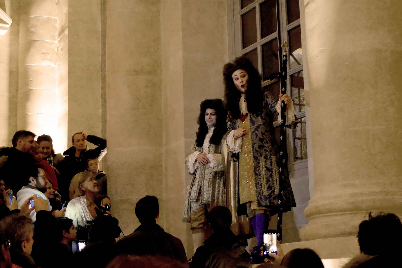 Accueillis par des aboyeurs royaux, les portes du Château de Versailles version nocturne s’ouvrent à nous. Les costumes sont chatoyants et gracieusement ornés.