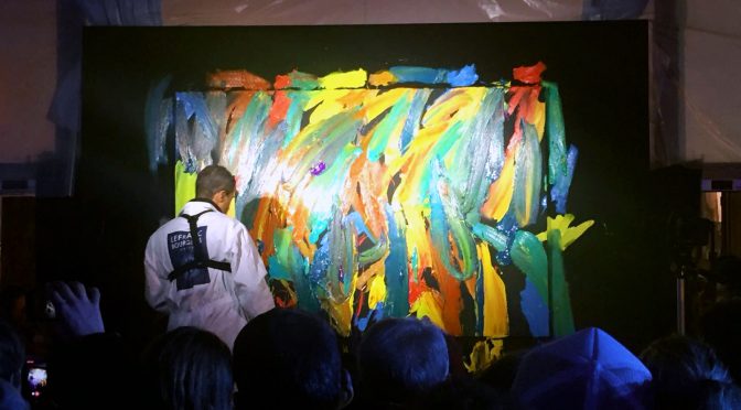 Place au street artist JonOne. Il se lance dans une performance sur les sons survoltés de Christine and The Queens. Nous retrouvons bien sa marque de fabrique en cohérence totale avec le thème de la soirée. En effet, tout l’espace de la toile est utilisé dans un assemblage harmonieux où les couleurs explosent. Le geste est libre tout en étant précis, dégageant une énergie emprunte de liberté. Le résultat est lumineux et éclatant !