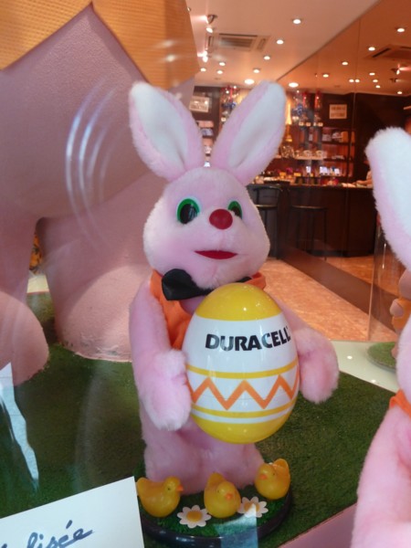 Mais ce n’est pas tout, l’œuf en chocolat qui n’en est plus un devient aussi étendard de marque, comme ce très joli lapin sponsorisé par une célèbre marque de piles, vendu quand même 33 euros en plein Marais.
