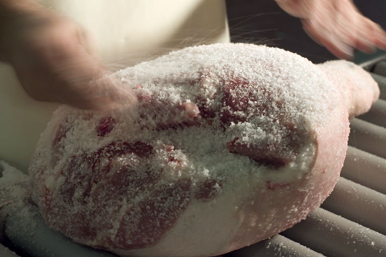 Le maître saleur recouvre ensuite la viande de sel. Après sept à dix jours, la cuisse est à nouveau frottée avec du sel puis remise en chambre froide, de 1 à 4°C, pour quinze à dix-huit jours. Une correction de la salaison peut suivre ou non selon l’avis de l’artisan.