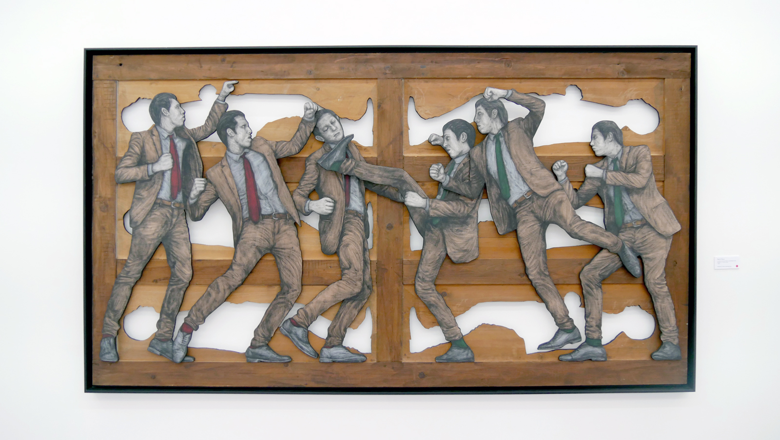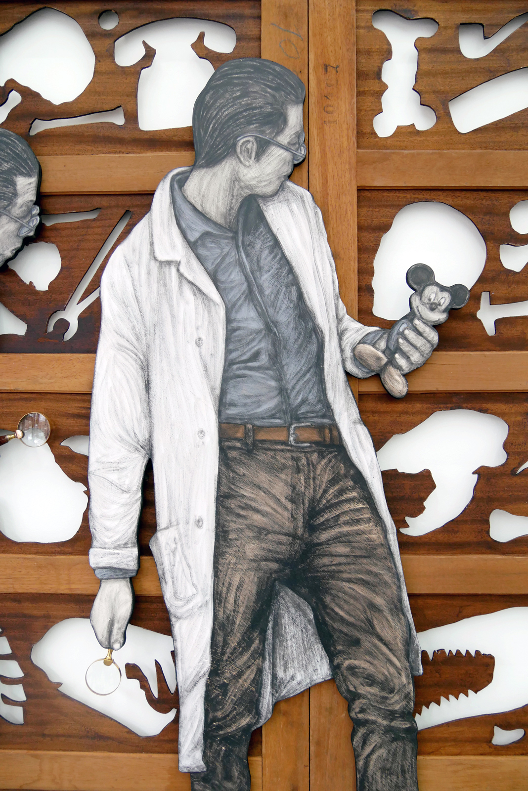 Levalet joue avec le bois, en le découpant, le gravant, le brûlant aussi. Son jumeau de dessin, ses doubles sortent très souvent du cadre, rebelles à tout enfermement ou contrainte. Et c’est ce qui accroche autant l’œil et l’adhésion : cet attrait pour le relief et ce jeu de perspective.