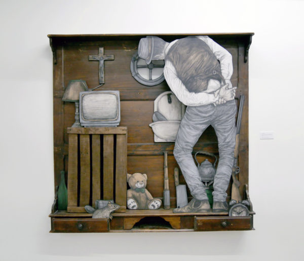 Installé près de Reims, l’artiste a gagné en surface pour son atelier et en terrain de chasse pour chiner à sa guise objets et meubles qui vont avoir les honneurs de devenir œuvre d’art exposée en galerie. Le dos d’une armoire lui a inspiré Recomposition, attiré par ses “super qualités plastiques“. Ensuite, il lui a fallu partir à la recherche de supports similaires pour la suite de la série. Un coffre a squatté 6 mois dans son atelier sans savoir quoi en faire et avant de devenir A bout de souffle et de trôner en plein milieu de la Galerie Openspace.