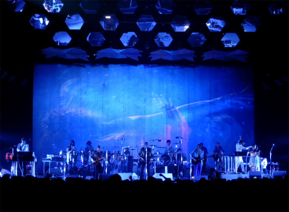 Nul besoin de faire des circonvolutions, le show offert par Arcade Fire était bien différent d’un soir à un autre. Ne serait-ce que le premier titre. Mardi, début du show par le chantons-hymne phare du dernier album, Reflektor, remplacée le lendemain Normal Person. Dans les deux cas, le public des gradins se lève pour suivre les rythmes de la dizaine d’interprètes sur scène qui court entre deux instruments et changer d’instrument en un éclair. Ensuite des titres communs pour les deux sets : Flashbulb Eyes et la fulgurance intacte de Neighborhood #3.