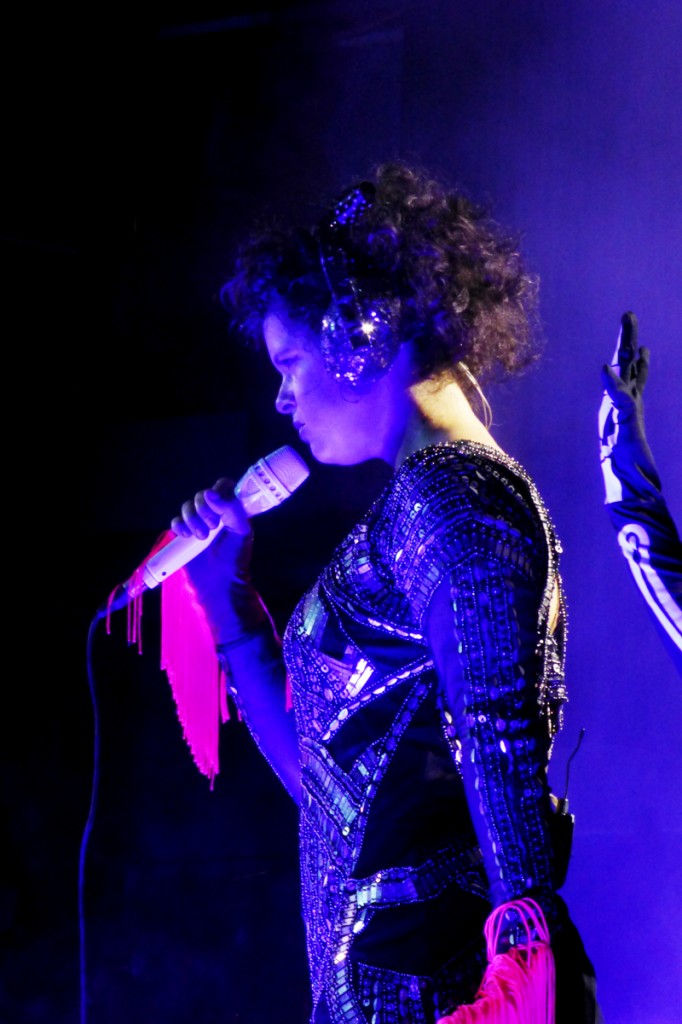 Au cours de la soirée, des interventions sur le podium situé dans la fosse en face de la scène viendront divertir les spectateurs. Un couple de danseurs chemises nouées au dessus du nombril danse sur We exist, un individu au costume pailleté reflète en pleine lumière sur Aflterlife. Et puis, Régine apparaît avec deux squelettes pour un duo incroyable avec Win face à elle de l’autre côté de la salle pour It’s Neve Over (Oh Orpheus).