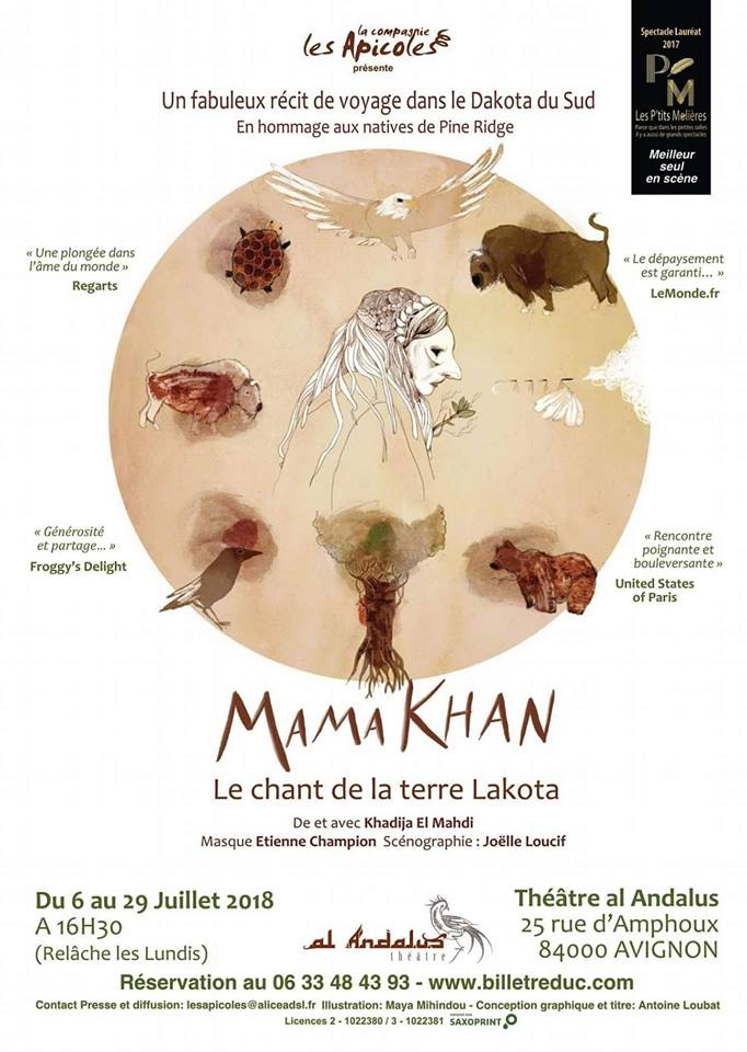 Au travers de récits Amérindiens contés par Mama Khan, notre guide atypique, nous partons à la découverte de la tradition Lakota (Dakota du Sud) et de ses merveilles. Tel est le pari osé, mais parfaitement maîtrisé, de Khadija El Mahdi. Lauréat du P’tit Molière du « Meilleur seul en scène 2017 », nous la retrouvons à Avignon Off 2018 au Théâtre al Andalus. Nous sommes sous le charme…