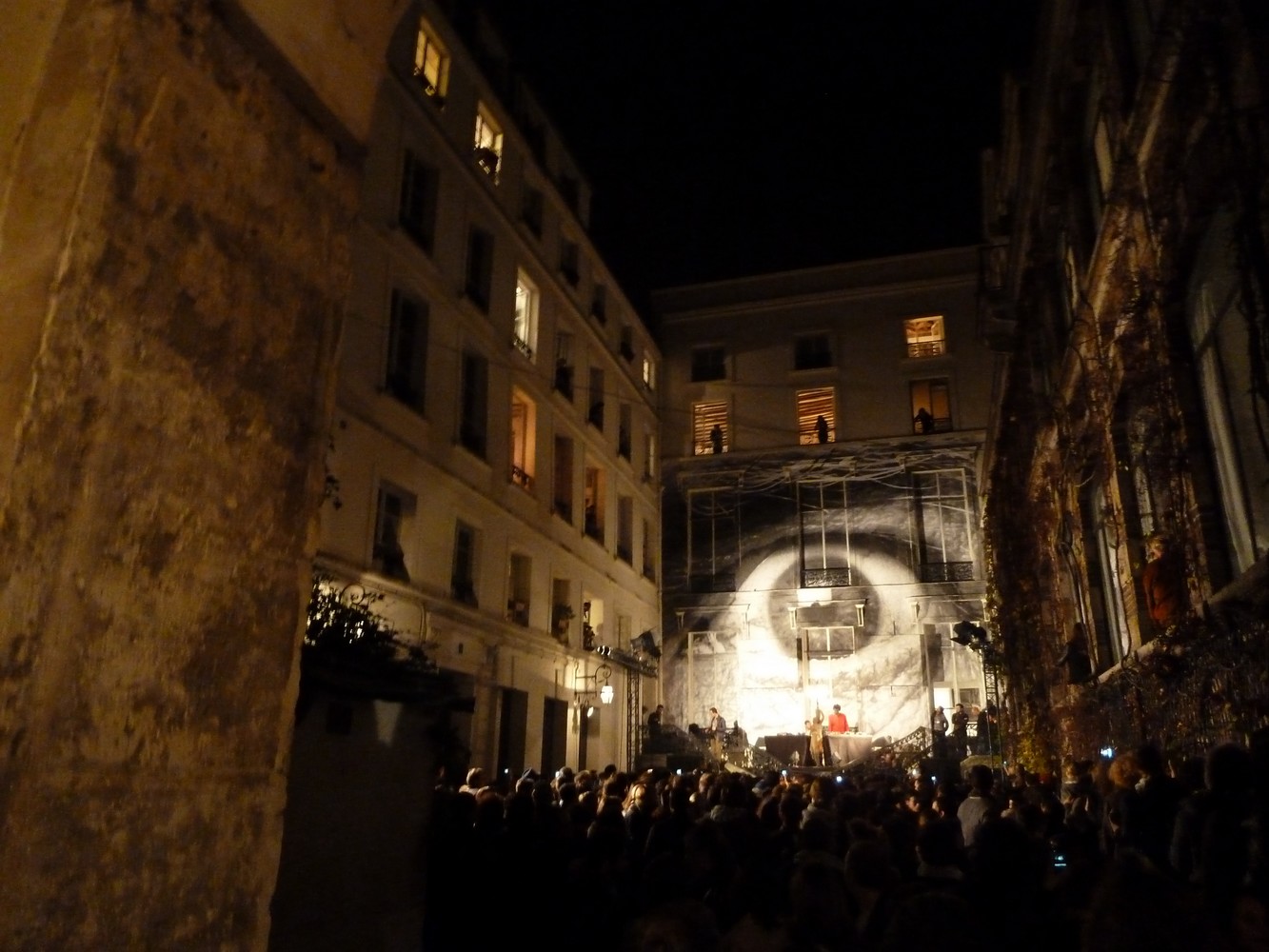 Après le parcours, le poster de vous sous le bras, vous pouviez donc surprendre, sur le perron, Robert Del Naja alias 3D en pleine balance pour le set du soir. L’info va circuler assez vite jusqu’à la fin de journée. A partir de 19h00, les visiteurs se tassent dans la cour, entre barrières de sécurité pour les riverains, allée pour se rendre au carré VIP à l’étage où tronait l’artiste Sophie Calle, collier de grosses perles au cou, assise sur son balcon.