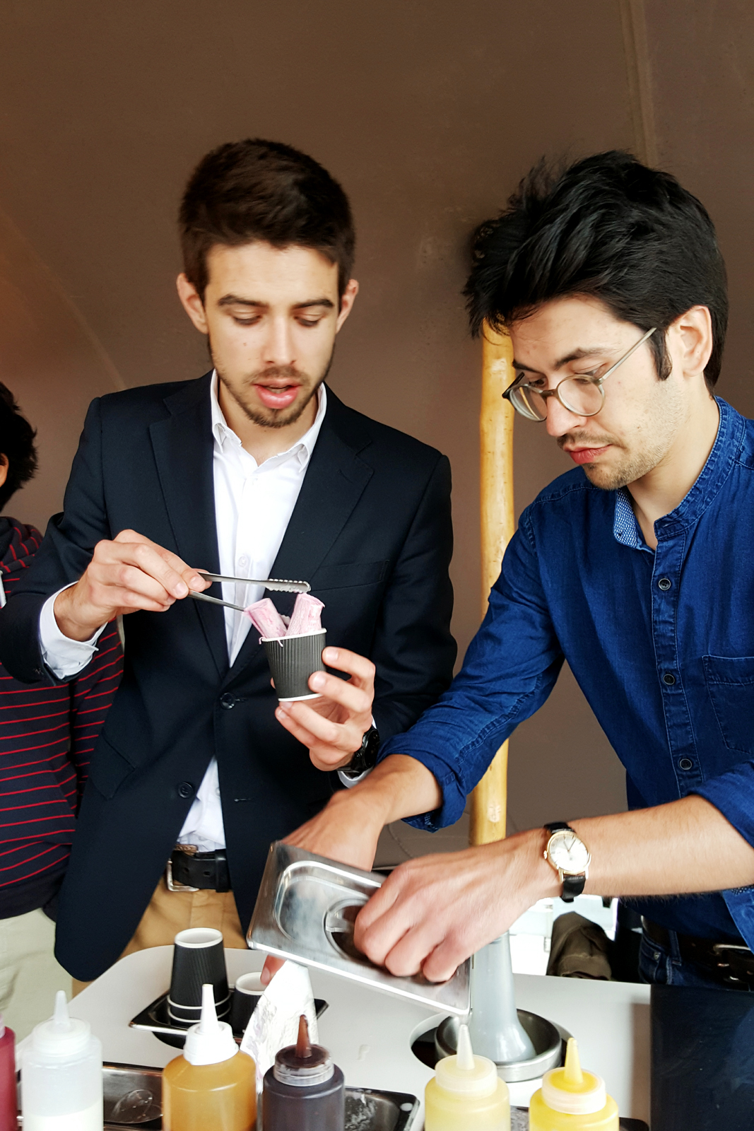 Pour le business, Quentin s’est associé à Félix et Thomas, designer produit, et à la manoeuvre au Perchoir ce jour-là. Ce dernier confirme : “c’est finalement plus un coup d’oeil qu’un coup de main à avoir, comme avec les pâtes” afin de reconnaître le bon moment pour rouler la glace. Son apprentissage a été de voir avant-tout comment la glace réagissait.