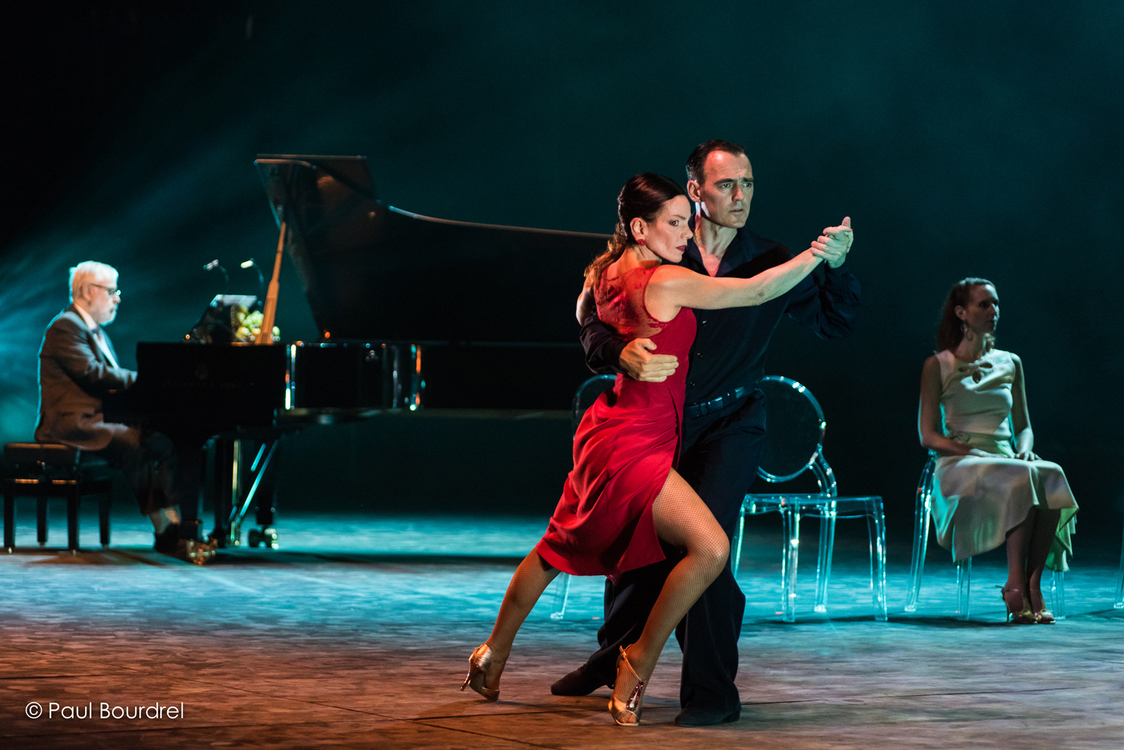 La scène du Grand théâtre de Fourvière paraît très épurée ce dimanche. On aperçoit les colonnes romaines, habituellement cachées par les décors, l’espace paraît immense. Les gradins ont gardé la chaleur de cette journée estivale. Les rangs sont clairsemés, la première vague de départ en vacances du 14 juillet n’y sans doute pas étrangère. J’ai hâte d’être embarquée dans cette nuit du tango.