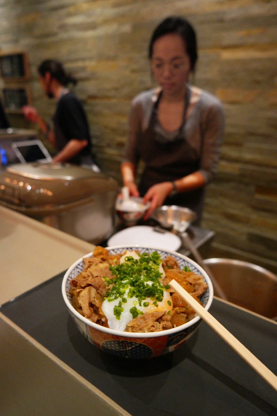 Bol de riz original gyudon Tour Eiffel Arc de Triomphe restaurant japonais Oishinoya Passage des Panoramas Rue de Saintonge Paris chef Shinichi Sato photo usofparis blogCe mardi soir, la perspective d’un bol de riz agrémenté de morceaux de viande au choix n’était pas ma priorité number one. Première surprise en traversant le Passage des Panoramas : la façade du restaurant. Dans la nuit, sa lumière traversant les carrés de verre nous enverrait presque illico dans une ruelle calme de Tokyo.