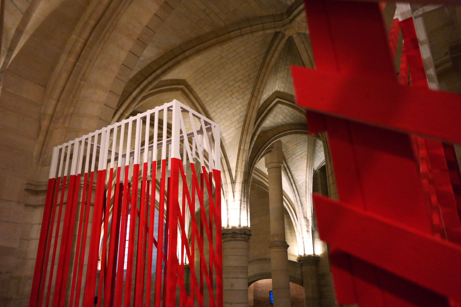 L’installation joue le plein contraste avec le lieu qui l’accueille. Les courbes des voûtes s’opposent à la régularité des morceaux de bois. Le duo rouge et blanc s’impose face à la pierre qui finalement s’incline.