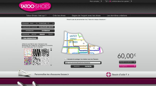 Les petits points négatifs du site : un seul modèle proposé, style Converse, en version basse ou montante, les possibilités de mise en forme des textes assez limitées et l’impossibilité de dupliquer le design de la chaussure droite sur la gauche ou inversement.