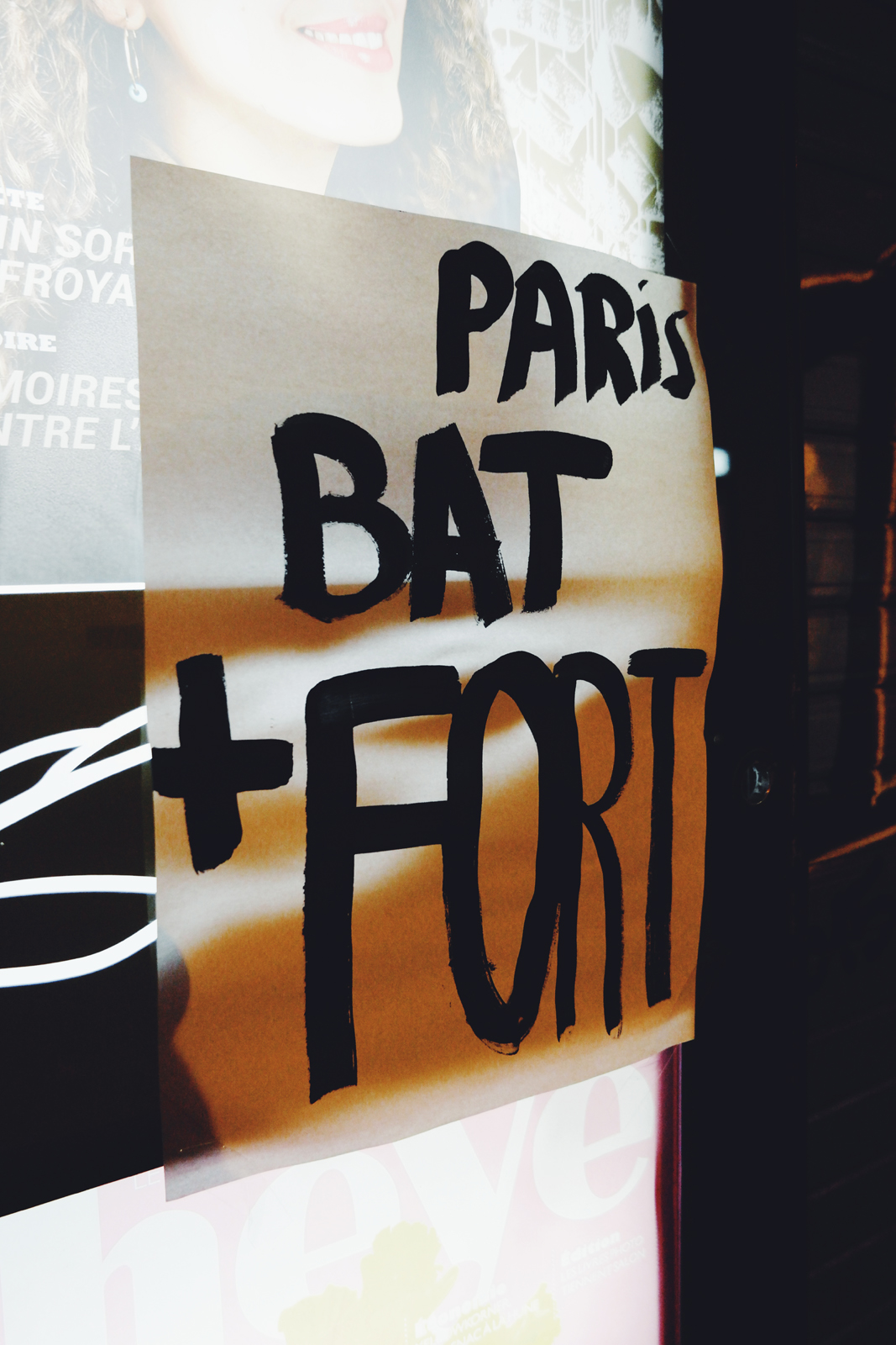 Nous avons partagé sur les réseaux sociaux les murs graffés pour l’occasion sur la Place de la République. Ici, une feuille simple affichée à quelques pas seulement du Bataclan, sur un kiosque à journaux. Simple et efficace.