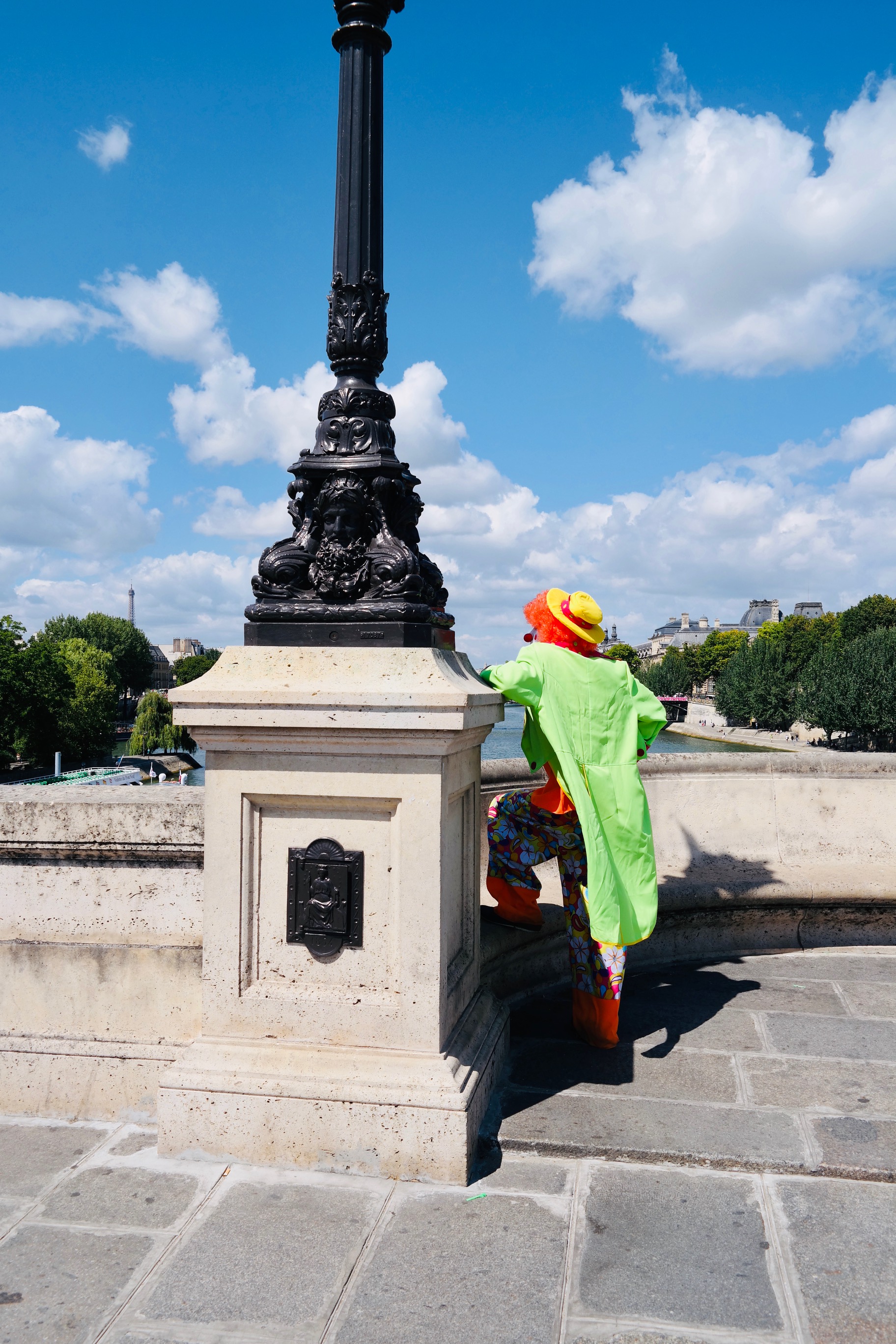 Nous sommes tous égaux face au froid alors qu’un beau soleil nous ferait croire l’inverse. Preuve en est ce clown sur le Pont Neuf qui garde veste et chapeau malgré le beau temps, tout en attendant que la pleine chaleur arrive enfin.
