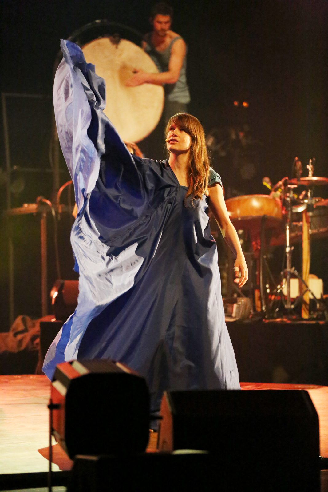 Début tout en douceur et facétie, la chanteuse apparaît drapée, allongée au sol puis se lève pour entonner un premier titre.
