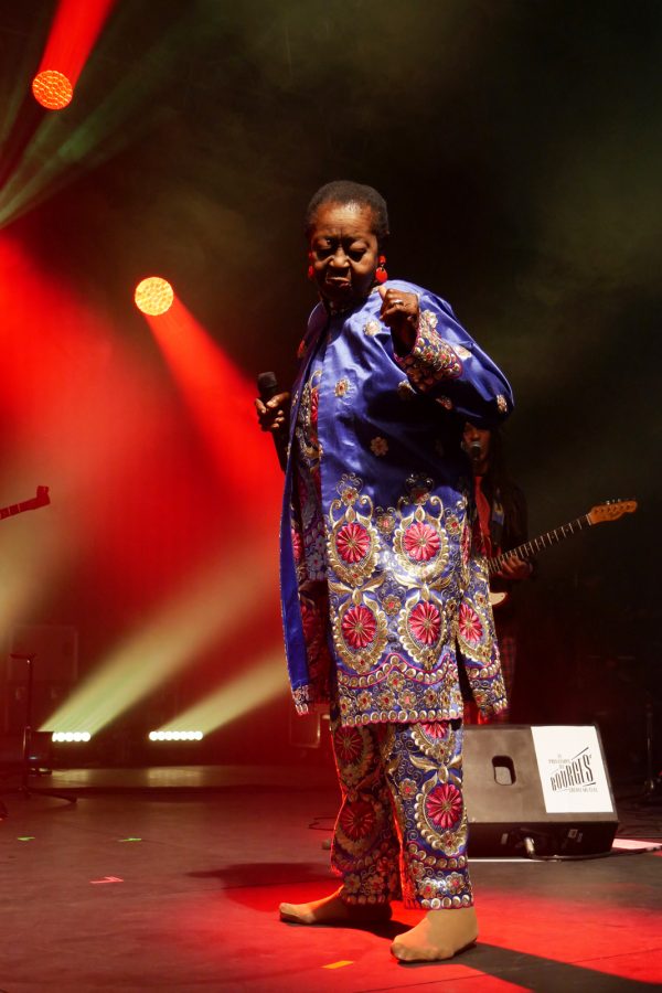 Immanquable la septuagénaire (77 ans le 27 avril) facétieuse venue de Trinidad. Elle a chauffé le Palais d’Auron avec un enthousiasme impressionnant. Elle arrive à tous petits pas sur scène, accompagnée d’un membre de son équipe. Et une fois dans son espace de jeu, elle navigue d’un bord à l’autre de la scène faisant découvrir sa tenue flamboyante et sa danse du ventre. À la fin du premier titre, elle quitte ses chaussures. Ses petits pieds font peine à voir mais ils continuent de porter l’artiste.