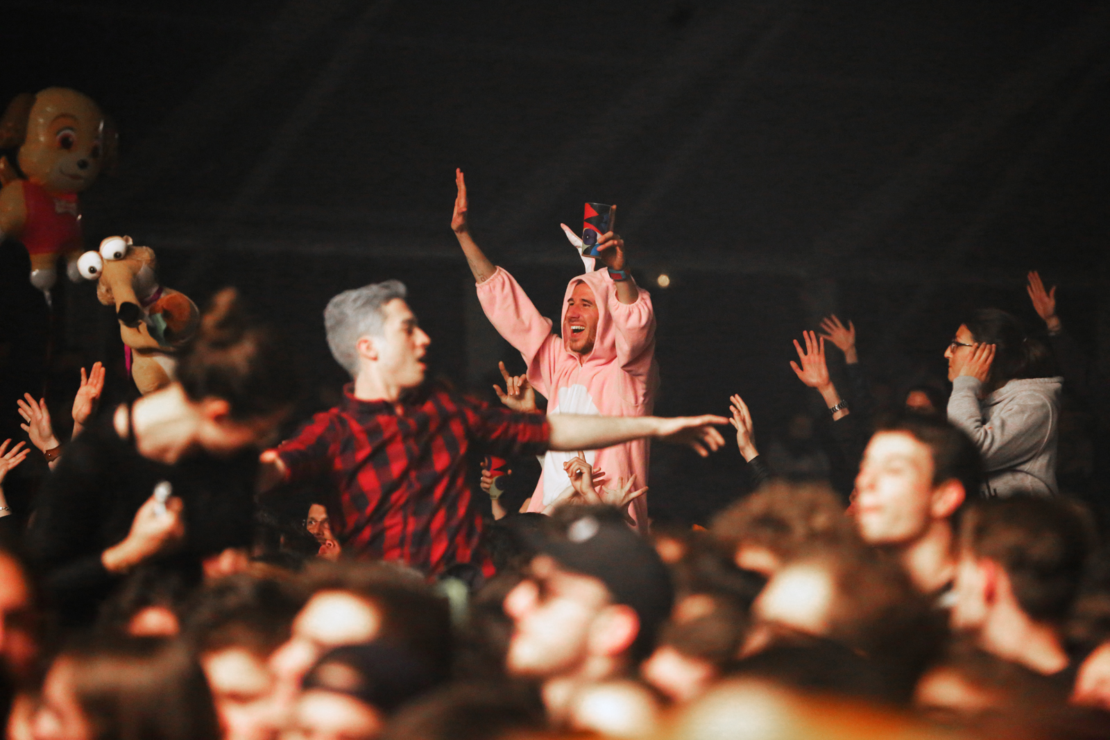 Le W devient une cour de récré en attendant l’artiste de 25 ans qui déplace les foules. Filles sur les épaules des garçons, ballons Calimero, cheval, Minions ou Barbapapa. Garçons déguisés en licorne ou lapin rose… L’ambiance est à la déconne totale.